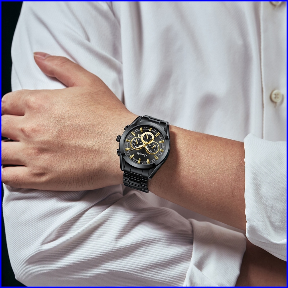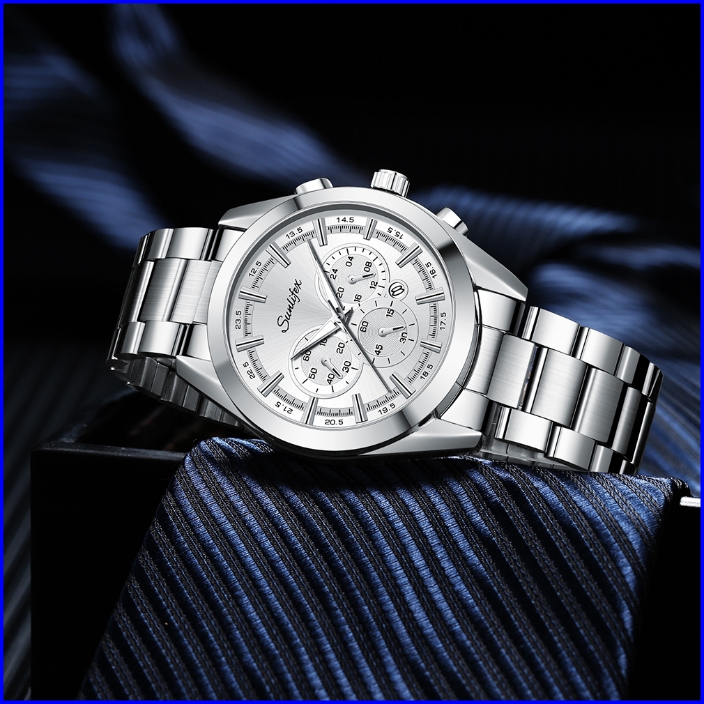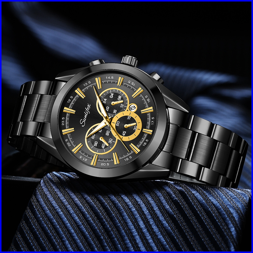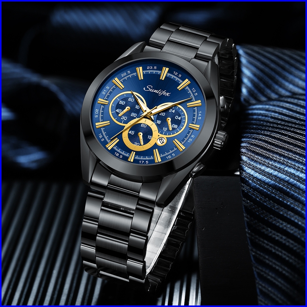 Sunlifex Jam Tangan Pria Kalender Santai Kuarsa Tali Stainless Steel Jam Tangan Cowok Original 9104