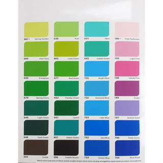 110 Natural White, SW Super White, 370 Broken White, 461 Pearl White, 462 Lunar Cream, 466 Golden Yellow, 199 Sunkist, 470 Banana, 480 Lemonade, 465 Medium Yellow, 179 Pumpkin Orange, 160 Carrot, 190 Falme Orange, 178 Chile Red, 192 Vermillion, 191 Sunrise, 310 Mocha, 334 Light Mahogany, 194 Maroon, 329 Golden Brown, 330 Copra Brown, 331 Mahogany Brown, 328 Golden Honey, 333 Caramel Apple, 301 Candy Brown, 309 Cinnamon, 630 Kiwi, 662 Lime Green, 671 Bud Green, 670 Spring Green, 660 Aloe Vera, 650 Evergreen, 652 Pandan Green, 657 Laurel, 631 Mint, 642 Cobalt Green, 651 Salem Green, 645 Light Green, 732 Diamond Blue, 753 Lake Blue, 733 Ocean Blue, 648 Dark Green, 755 Bright Blue, 752 Sea Blue, 750 Deep Ocean, 754 Blue Royal, SB Super Black