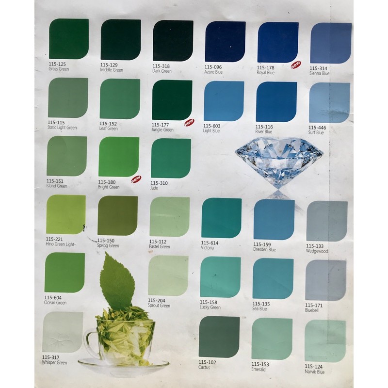 Super White, Black, Permanent Red, Kansai Red, Bright Orange, Lemon Yellow, Bright Yellow, Grass Green, Azure Blue, River Blue, Hino Green, Victoria, Dresden Blue, Chestnut Brown, Leather, Teak Brown, Yukon Yellow, Primrose, Cream, Red Orange, Middle Green, Surf Blue, Iron Grey, Sierra Brown, Beach Ivory, Ivory White, Sunkist Orange, Orchid Violet, Soft Violet, Edelweiss, Ryan Grey, Bright Green, Irish White, Ocean Green, Light Blue, Stone Grey, Ash Grey, Medium Grey, Mahogany Brown, Light Pink, Valentine Pink, Autumn Orange, Banana Yellow, Signal Red, Terracota, Soft Purple, Off White, Milky Cream, Clear Varnish, Vita Cream, Whisper Cream, Golden Yellow, Mimosa, Egg White, Pearl White, Honey Dew, Banff Blue, Emerald, Pastel Green, Royal Blue, Cactus, Grey Tint, Army Brown, Light Grey, Static Light Green, Sprout Green, Jade, Hella Grey, Spring Green, Narvik Blue, Leaf Green, Sea Blue, Jungle Green, Wedgewood, Beige