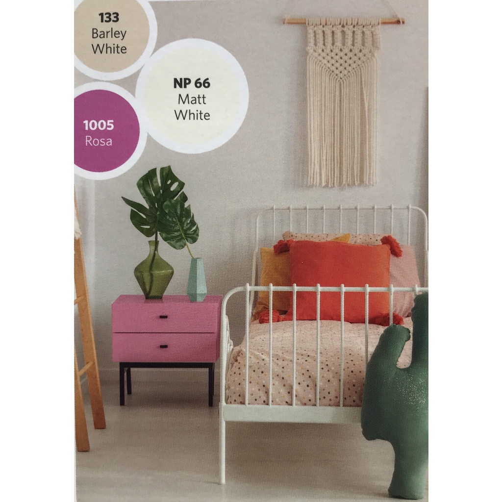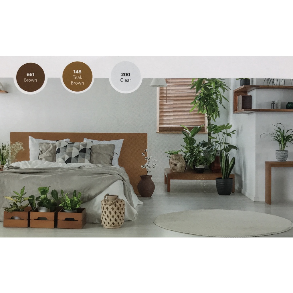 Putih, Putih Kental Gloss, Putih Doff, Hitam, Hitam Doff, Bunga Bali, Ice Cream J, Teak Brown, Yellow Canary, Vermillion, Brown, Pacific Blue, Leaf Green, Clear, Sienna Brown, River Blue, Emerald, Mer Bleue, Cream, Barley White, Verde Frutta, Pelita Green, Deep Brown, Topez Azuro, Ash Grey, Papier Grey, Mayan Yellow, Rosa, Lemon Yellow, Vivid Red, Saddle Tan, Ocean Blue, Silver, Ever Green, Salem Green, Orange, Maroon, Sempre Verde, Harbar Green, Dark Green, Platinum Grey J, Medium Yellow J, Red Oxide, Hino Green, Lavender Grey, Dove Grey, Del Fegato, Verde Dello, Gialla, Coral
