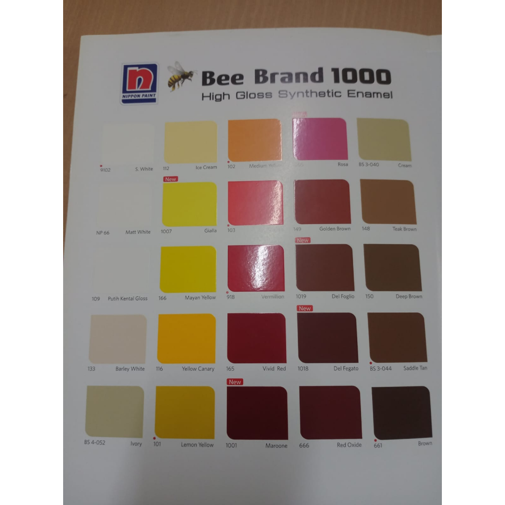 9102  S .White, 112 Ice Cream, 102 Medium Yellow, 1005 Rosa, BS 3-040 Cream, NP 66 Matt White, 1007 Gialla, 103 Orange, 149 Golden Brown, 148 Teak Brown, 109 Putih Kental Gls, 166 Mayan Yellow, 918 Vermillion, 150 Deep Brown, 133 Berley White, 116 Yellow Canary, 165 Vivid Red, 1018  Del Fagato, BS 3-044 Saddle Tan, BS 4-052 Ivory, 101 Lemon Yellow, 1001 Maroone, 666  Red Oxide, 661 Brown, B5 8-087 Twilight Bl, 1012 Verde Frutta, 124 Pelita Green, 115 Silver, BS 9-093 Ash Grey, 104 Pacific Blue, 569 Hino Green, 105 Leaf Green, BS 9-095 Lavender Gr, 151 Sienna Brown, 141 Ocean Blue, 1011 Sempre Verde, 948 Harbar Green, 119 Platinum Grey, 106 Coral, 138 River Blue, 126 Ever Green, 125 Salem Green, 118 Dove Grey, NP 666 Matt Black, 147 Azure Blue, 1010 Verde Dello, 135 Emerald, BS 9-097 Papier Grey, 9103 S.Black