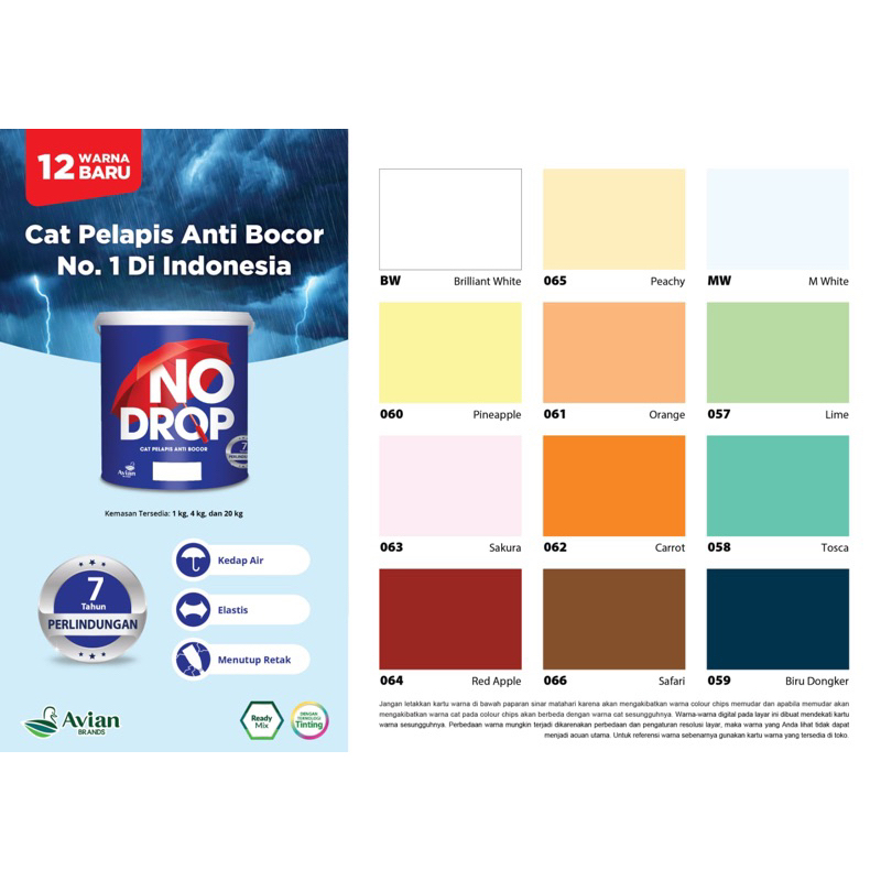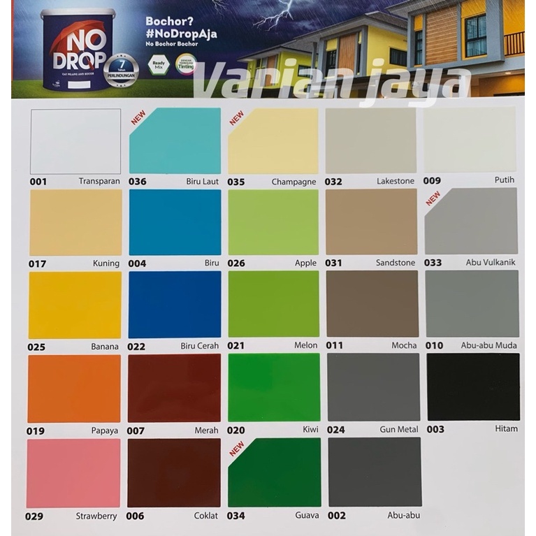 001 Transparan, 002 Abu-abu, 003 Hitam, 004 Biru, 006 Coklat, 007 Merah, 009 Putih, 010 Abu-abu Muda, 011 Mocha, 017 Kuning, 019 Papaya, 020 Kiwi, 021 Melon, 022 Biru Cerah, 024 Gun Metal, 025 Banana, 026 Apple, 029 Strawberry, 031 Sandstone, 032 Lakestone, 033 Abu Vulkanik, 034 Guava, 035 Champagne, 036 Biru Laut, MW MWhite, 057 Lime, 058 Tosca, 059 Biru Dongker, 061 Orange, 062 Carrot, 066 Safari, 065 Peachy, BW Brilliant White, 060 Pineapple, 063 Sakura, 064 Red Apple