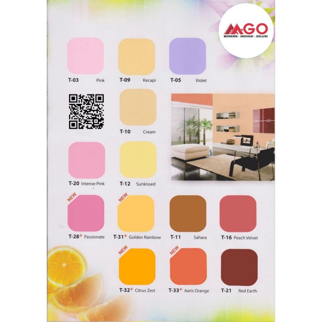 PUTIH / WHITE, T-01 M-WHITE, T-02 ARCTIC FREEZE, T-03 PINK, T-05 VIOLET, T-06 MINTY LEAF, T-07 LIME DROP, T-09 KECAPI, T-10 CREAM, T-11 SAHARA, T-12 SUNKISSED, T-15 MIST BLUE, T-16 PEACH VELVET, T-17 FANTASY GREEN, T-18 WHEAT GRAIN, T-19 LINEN, T-20 INTENSE PINK, T-21 RED EARTH, T-22 OCEANIC, T-23 MEADOW FRESH, T-25 MOCCA BLEND, T-26 STONY RIVER, T-27 STONE GREY, T-28 PASSIONATE, T-29* BLUE VACATION, T-30 BLUE SAPPHIRE, T-31* GOLDEN RAINBOW, T-32 CITRUS ZEST, T-33* AERIS ORANGE, T-35* SQUASH GREEN, T-36* JADE GREEN, T-37* MIAMI GREEN