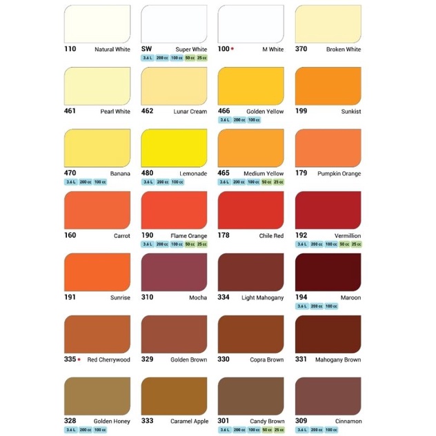 755 BRIGHT BLUE, 110 NATURAL WHITE, 100 M WHITE, 462 LUNAR CREAM, 305 LEATHER, 731 TWILIGHT BLUE, N34-001 LEGENDARY BL, N31-001 SMOKY WILLOW, N30-002 GREY SHIMMER, N32-003 DESERT STORM, G26-002 CAPELLA GARD, G25-001 JADE PALACE, G29-004 RETRO GREEN, B21-002 BUCKETS OF R, B20-002 OH SANTORINI, G27-003 SPRING HARVE, Y6-004 YUMMY YELLOW, V19-004 DIAMOND BAY, O10-002 FADED ROSE, R14-005 SAKURA BLOOM, B24-005 ONE & ONLY, R15-005 DREAMING OF, Y1-002 SWEET MAPLE, G26-003 CLEAN AQUA, SBM SUPER BLACK DOF, SWM SUPER WHITE DOF, Y1-003 PERSIAN SAND, Y1-005 TOUCH OF CREA, Y2-005 CREAM SODA, R12-003 MICA ROSE, V17-003 PURE LILAC, V16-003 CHEERFUL MEL, G25-002 DAYDREAMER G, Y1-004 HORIZON HILLS, B24-001 AQUAMARINE, 370 BROKEN WHITE, 333 CARAMEL APPLE, SB SUPER BLACK, 642 COBALT GREEN, 924 DOVER GREY, B23 002 BLUE IBIZA, B24 002 STAR RIVER, G26 006 HEARTLAND DR, G31 004 BUBBLE TROUB, G24 005 MAZE RUNNER, G11 006 MISTLETOES K, R12 004 FLUSHED PINK, SW SUPER WHITE, N6 006 OLD FRIENDS, N6 004 CLOSE TO HOME, G18 003 VEGETABLE GA, V16 003 CHEERFUL MEL, 471 BRIGHT YELLOW, 328 GOLDEN HONEY, 301 CANDY BROWN, 193 LIGHT PINK, 911 DOVE GREY, 915 DARK GREY, N9 006 HEALING ALOE, VERNIS / CLEAR