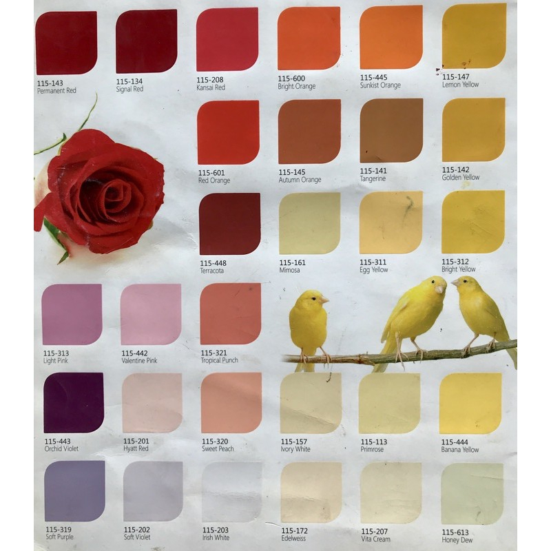 115-449 Milky Cream, 115-110 Off White, 115-319 Soft Purple, 115-448 Terracota, 115-134 Signal Red, 115-444 Banana Yello, 115-145 Autumn Ornge, 115-313 Light Pink, 115-607 Mahogany Bwn, 115-442 Valentine P, 115-138 Medium Grey, 115-106 Ash Grey, 115-610 Stone Grey, 115-603 Light Blue, 115-604 Ocean Green, 115-203 Irish White, 115-180 Bright Green, 115-206 Ryan Grey, 115-172 Edelwelss, 115-202 Soft Violet, 115-445 Sunkist O, 115-157 Ivory White, 115-160 Beach Ivory, 115-107 Sienna Brown, 115-609 Iron Grey, 115-446 Surf Blue, 115-129 Middle Green, 115-601 Red Orange, 115-119 Cream, 115-113 Primrose, 115-123 Yukon Yellow, 115-137 Teak Brown, 115-170 Leather, 115-602 Chestnut Brw, 115-159 Dresden Blue, 115-614 Victoria, 115-221 Hino Green L, 115-116 River Blue, 115-125 Grass Green, 115-312 Bright Ylw, 115-147 Lemon Yellow, 115-208 Kansai Red, 115-143 Permanent Rd, 115-582 Black, 115-731 Super White, 115-443 Orchid Viole, 115-096 Azure Blue