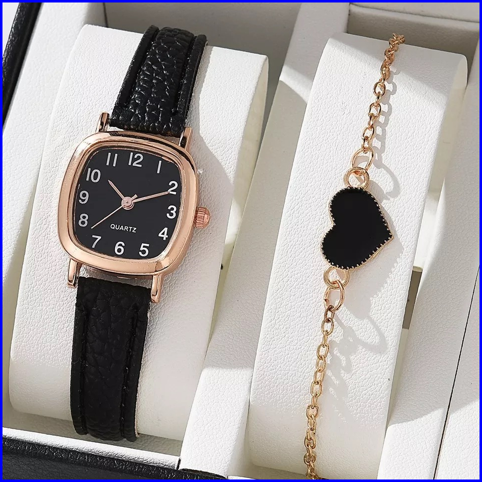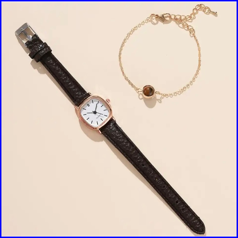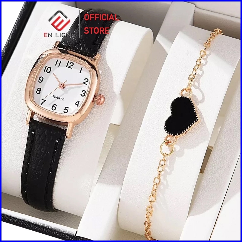Enligne - El915 - Jam Tangan Fashion Wanita Kotak Kecil Tali Kulit - Set Gelang Bonus Box Cantik