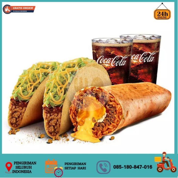 Kombo Bell Duo Uno, Kombo Bell Duo Dos, Value Fiesta With Taco, Kombo Chimichanga, Super Bell Bowl, Kombo Bowl and Blast, New Party Pack 1, New Party Pack 2, Kombo Double Stacked Taco, Kombo Double Stacked Taco Supreme, Kombo Bell Bowl Fresh, kombo Bell Bowl Pico, Kombo Bell Bowl Spicy, Combo Taco Rice Original, Combo Taco Rice Cheese, Kombo Crunchy Taco Supreme, Kombo Soft Taco Supreme, Kombo Crunchy Taco, Kombo Soft Taco, Kombo Kickin Chicken Taco, Kombo Naked Chicken Taco, Kombo Chicken Quesadilla, Kombo Cheese Quesadilla, Kombo Grilled Stuft Buritto, Kombo Cheesy Burrito, Kombo Bell Rice Kebuli, Double Stacked Taco, Double Stacked Taco Supreme, Crispy Chicken, Chimichanga, Spicy Bowl, Pico Bowl, Mushroom Soup New, Fresh Bowl, Taco Rice Cheese Lovers, Taco Rice Original, Bell Rice Kebuli, Purple Bag, 2 Kickin Chicken™ Tacos, Chicken Quesadilla, 2 Crunchy Taco Supreme™, 2 Soft Taco Supreme™, Crunchy Taco Supreme™, Soft Taco Supreme™, Soft Taco, Crunchy Taco, Naked Chicken Taco™, Chickstar, Grilled Stuft Burrito, Kickin Chicken Taco, Fries, Cheesy Roll, Nacho Fries, Cheesy Chips, Cheese Quesadilla, Supreme Loaded Nachos, Loaded Griller, Naked Chicken Chips with Cheese, Mexican Wings 4, Sharabl Platter, Mexican Wings 8, Loaded Fries Med, Creamy Jalapeño, Sambal Korek, Creamy Ranch, Nacho Cheese Sauce, Sour Cream, Kickin Sauce, Pico De Gallo Salsa, Coke Zero, Coca-Cola Float, Fanta Float, Sprite Float, Coke, Fanta Strawberry, Sprite, Cola Lemonade, Pink Lemonade, Lemonade, Manggo Freeze, Mineral Water 330 ml, Iced Latte, Cappucino, Americano, Caffee Latte, Iced Americano, Hot Tea, Chocodilla, Cinnamon Tostada