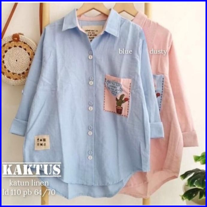 Vallina Outfit - Kaktus Shirt Blouse Path Embroidery Linen Rami Baju Atasan Wanita Muslim Tunik Premium M - Xl
