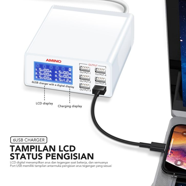 AMINO 6 USB Port Multi Port Charger Fast Charger LED Function 40W 87W PD QC Super Fast Charger TYPE-C Kabel