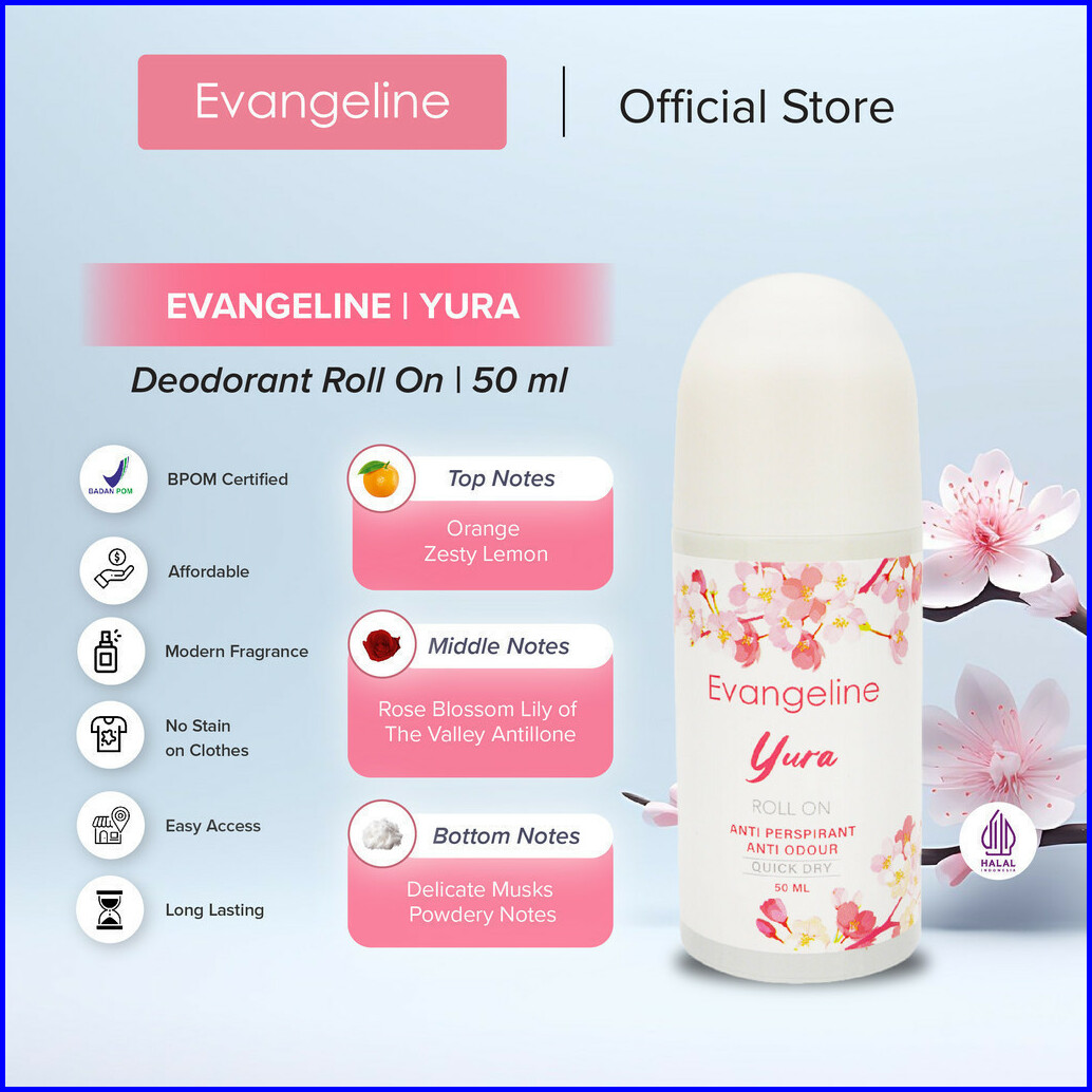 Evangeline Roll On Yura 50ml Deodorant Antiperspirant Perlindungan Sepanjang Hari Deodorant Wanita Ketiak Kering