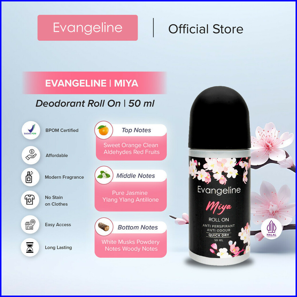 Evangeline Roll On Miya 50ml Deodorant Antiperspirant Perlindungan Sepanjang Hari Deodorant Wanita Ketiak Kering