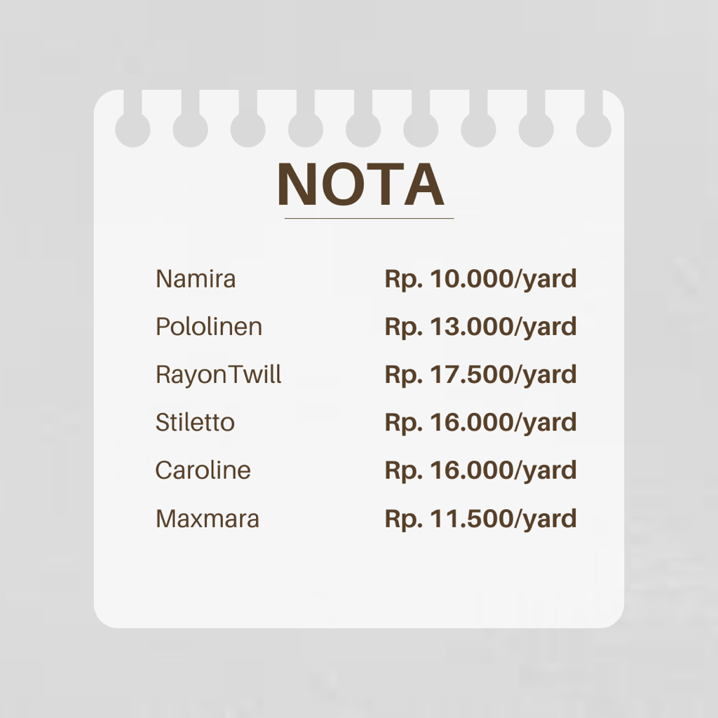 LATTE / 72 (ROL), OCEAN BLUE 108 (ROL), SAGE / 26 (ROL), MOCCA TUA 71 (ROL), ROSE BROWN 23 (ROL), ABU / 33 (ROL), PUTIH / 02 (ROL), DENIM / 97 (ROL), KUBUS / 03 (ROL), NAVY / 36 (ROL), MILO / 62 (ROL), MERAH ATI 18 (ROL), BIRU MD / 58 (ROL), HITAM / 38 (ROL), HJ BOTOL 98 (ROL), BW / 01 (ROL), COKSU / 125 (ROL), TAUPE / 163 (ROL)
