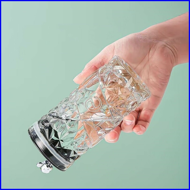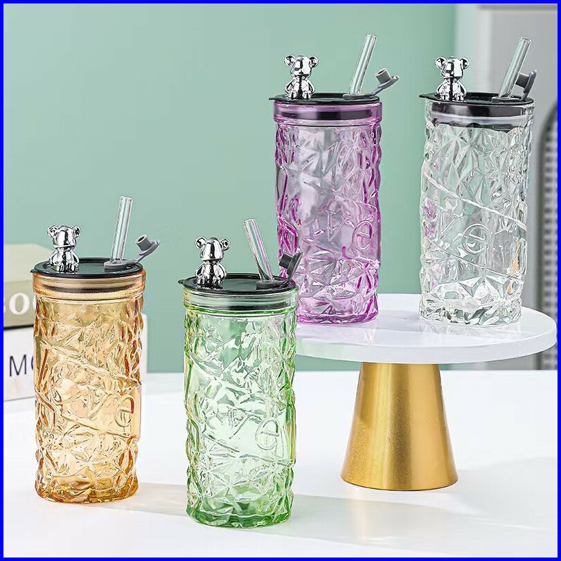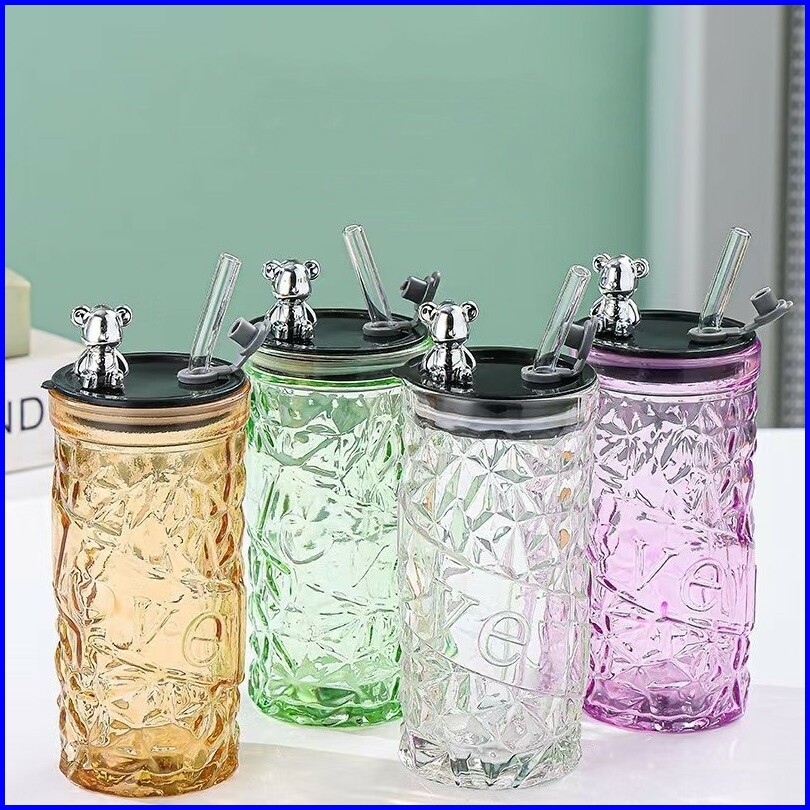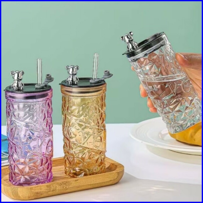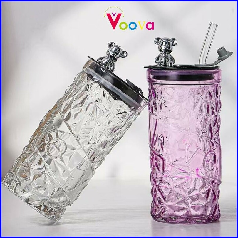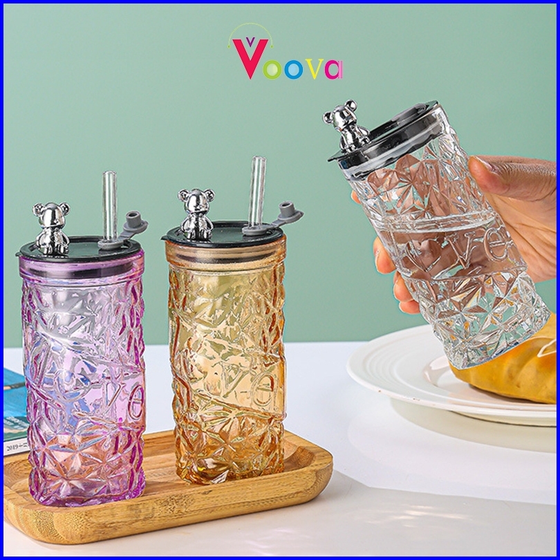 Voova Gelas Kaca Tumbler Kaca Aesthetic Bear Lid Glass Gelas Kaca Borosilicate Tinggi Cangkir Minuman Cangkir Kopi