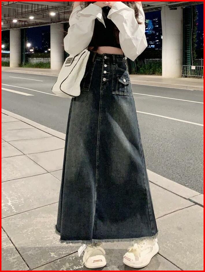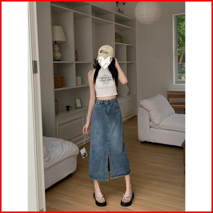 Rok Korean Style Panjang High Waist Slit A-line Skirt Rok Jeans Panjang