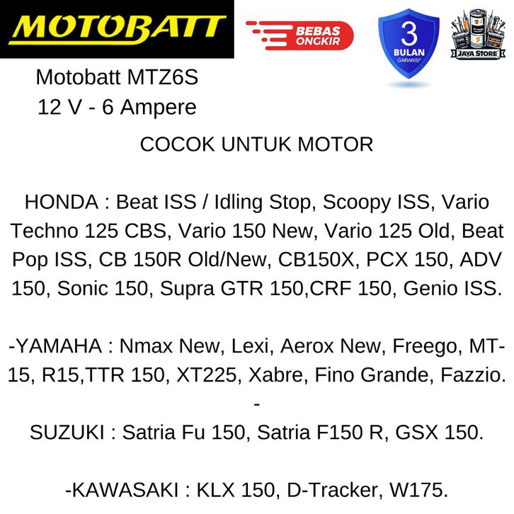 Aki Motor Beat ISS , Scoopy ISS, Vario Techno 125 CBS, Vario 15 New, Vario 125 Old Motobatt MTZ6S