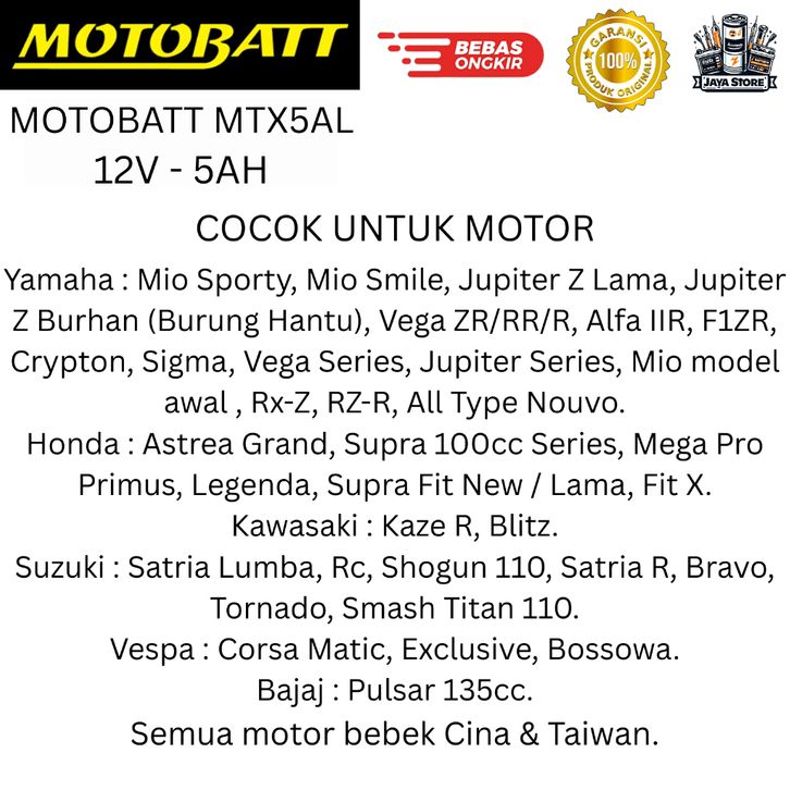 Aki Motor Satria Lumba, Rc, Shogun 11, Satria R, Bravo, Tornado, Smash Titan 11 Motobatt MTX5AL