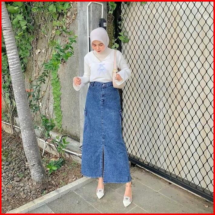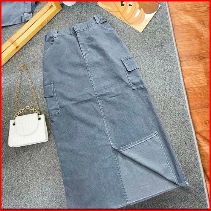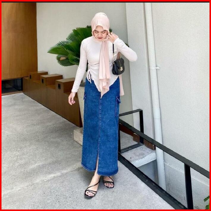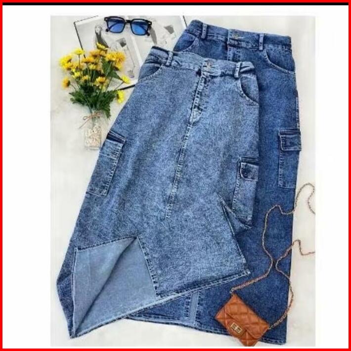 Rok Cargo Jeans Wanita Rok Jeans Highwaist Skirt Span Belahan Depan Kantong Samping Premium Terlaris Dan Termurah Panjan