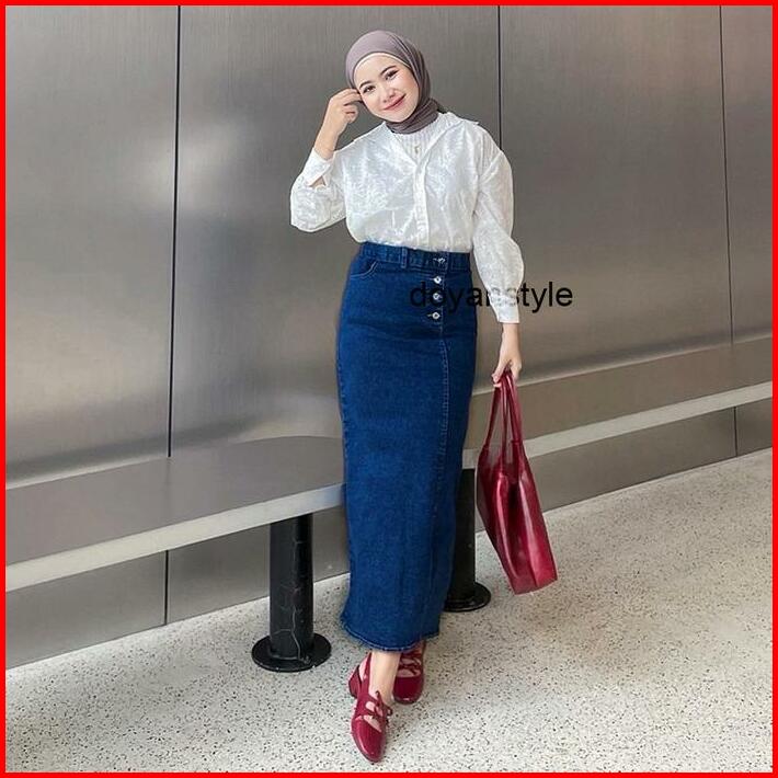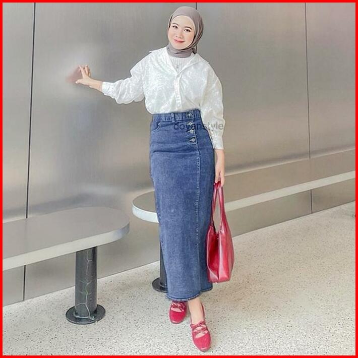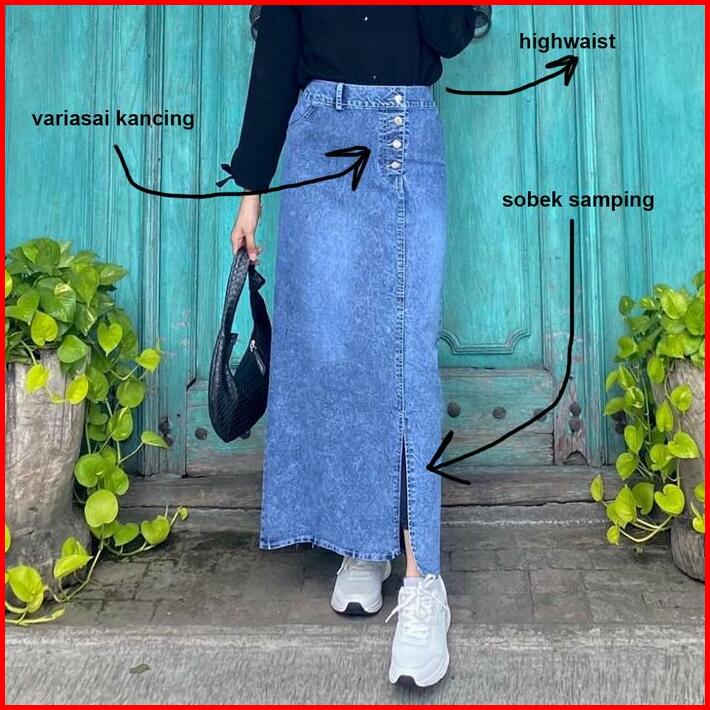 Highwaist Skirt Denim Jeans Rok Span Belah Samping Kancing Wanita Jumbo Panjang