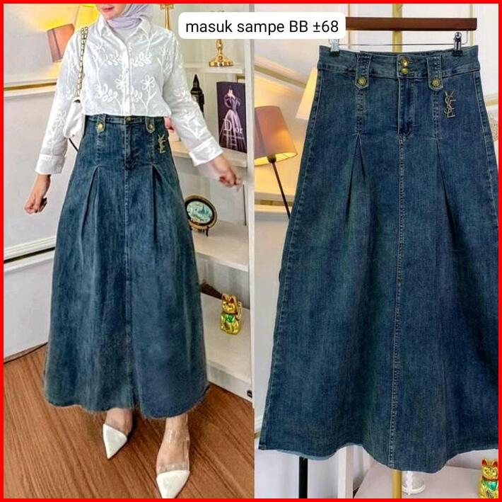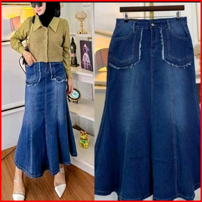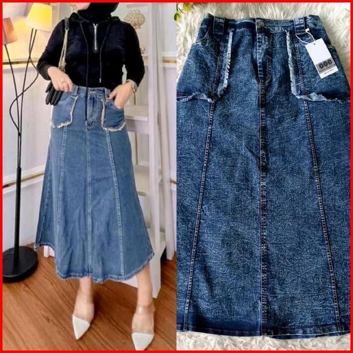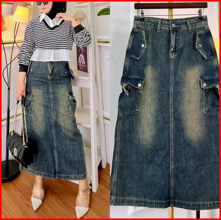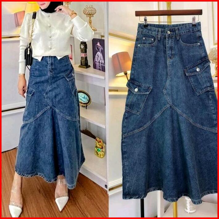 Rok Cargo Jeans Rok Wanita Span Model Kancing Belakang Karet Rok Denim Bawahan Rawis Rok Wanita Bahan Panjang