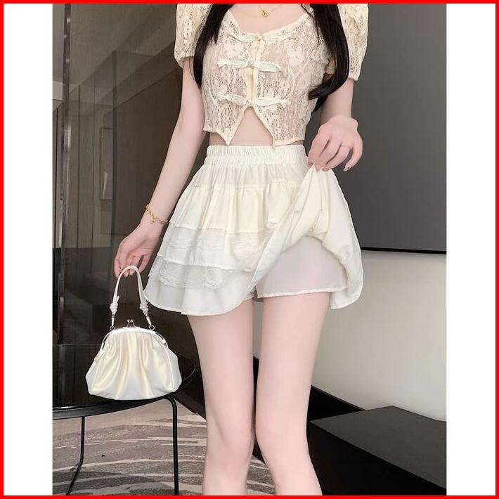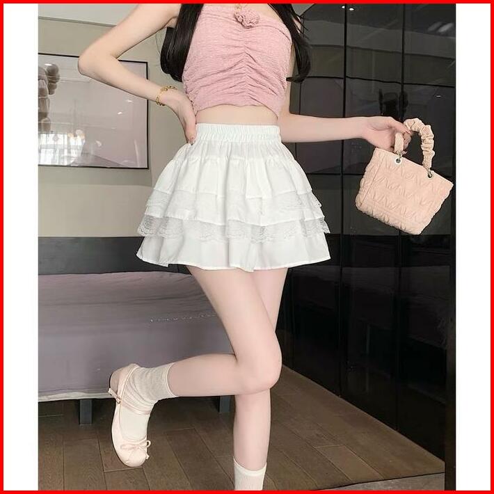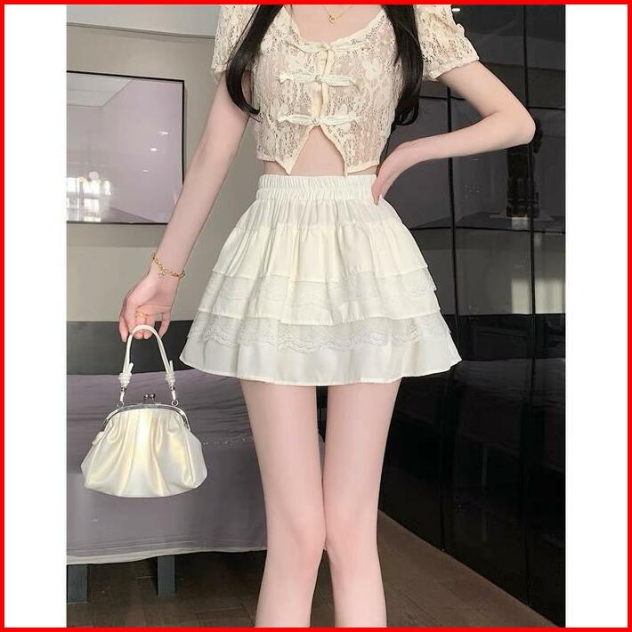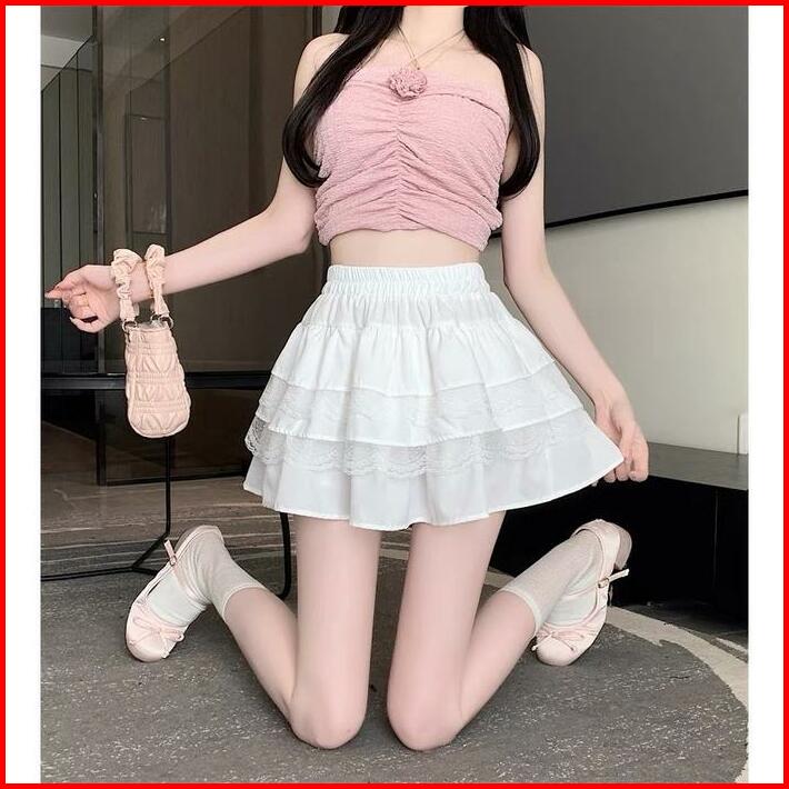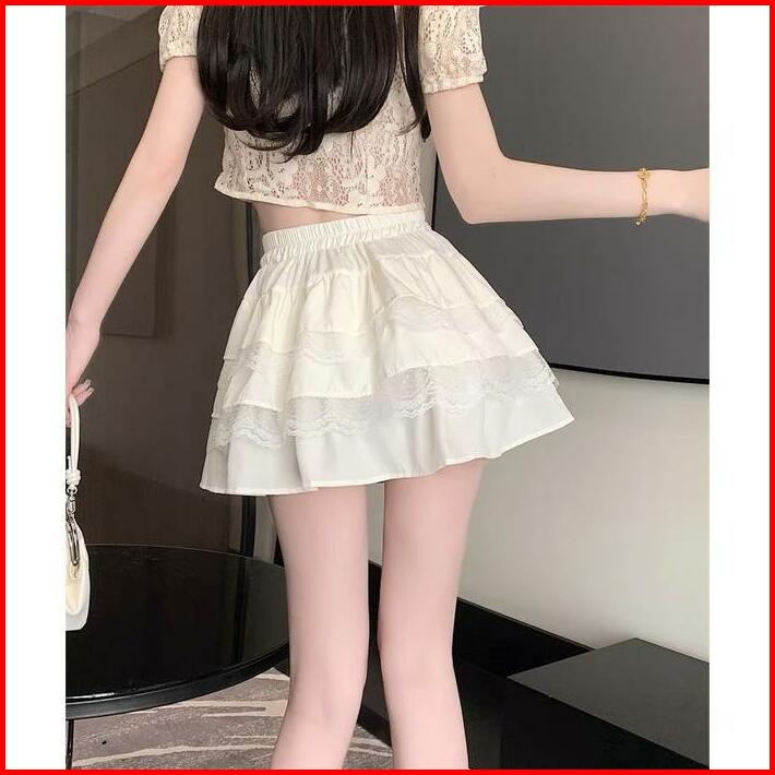 Rok Pendek Renda Putih Rok Kue Wanita Rok A-line Pelangsing Pinggang Tinggi Wanita