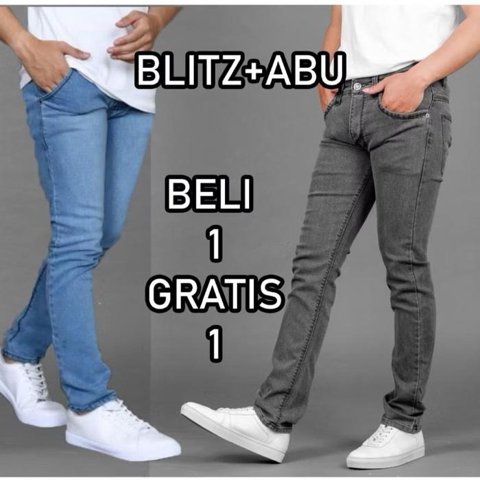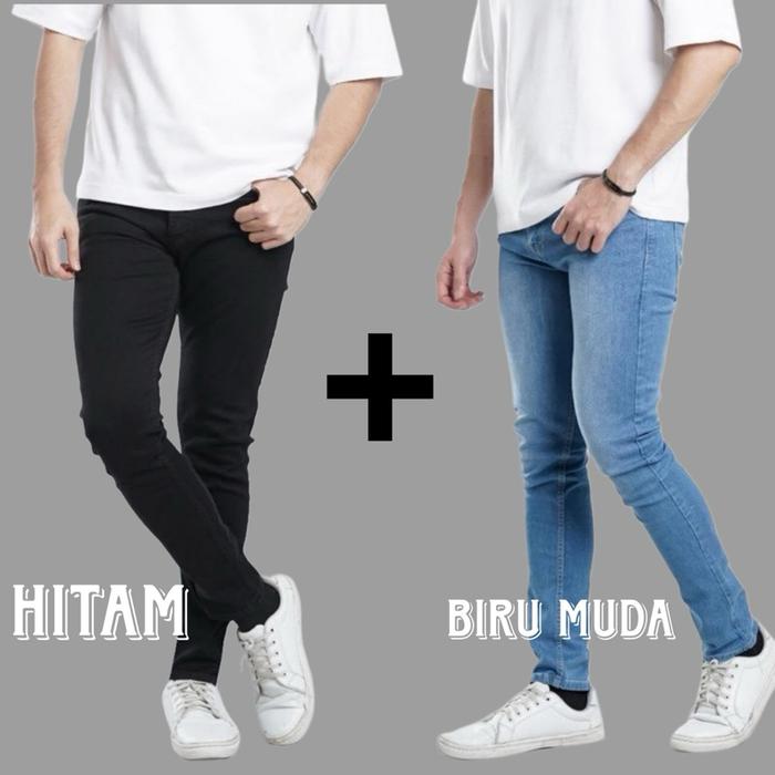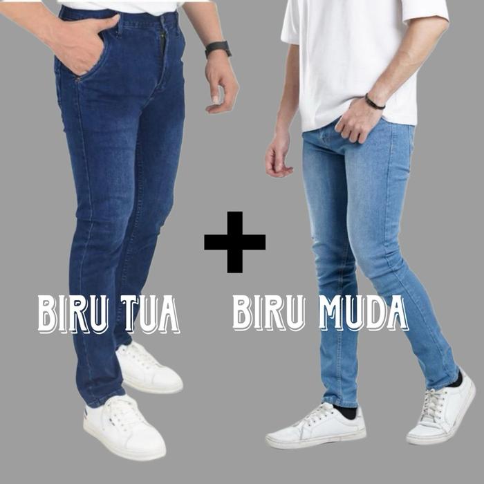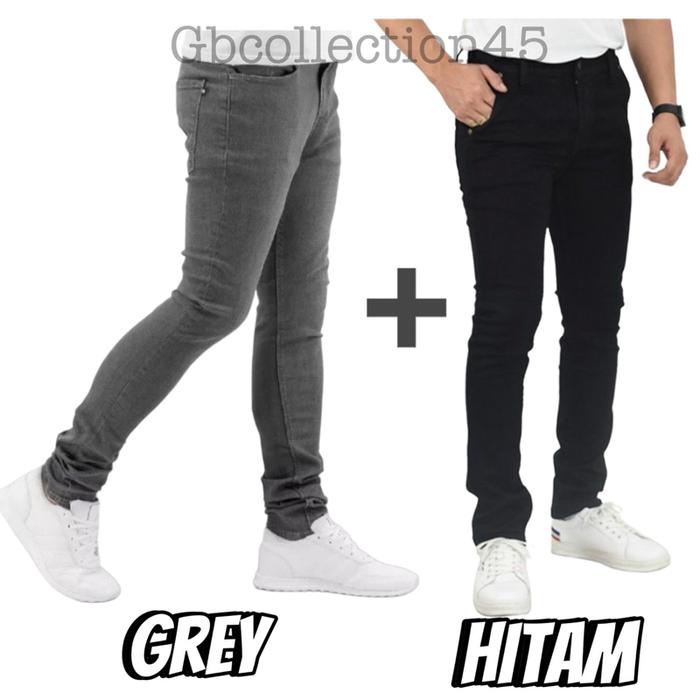 [Paket Hemat Isi 2 Pcs] Celana Jeans Pria Dewasa Skinny Celana Panjang Pensil - Biru Tua+Grey, 27