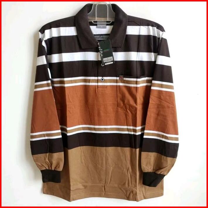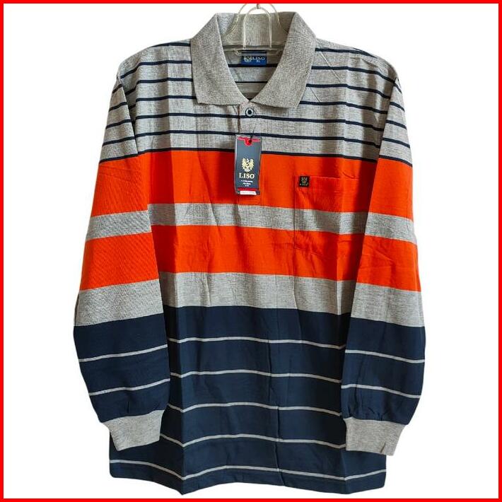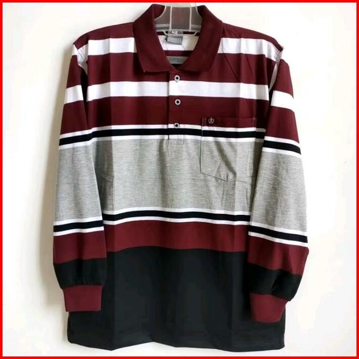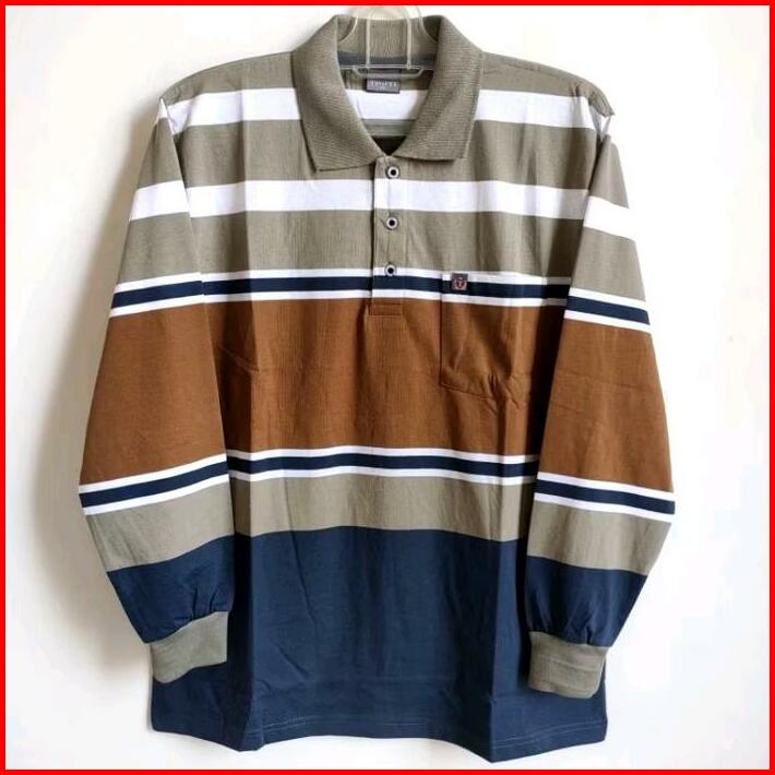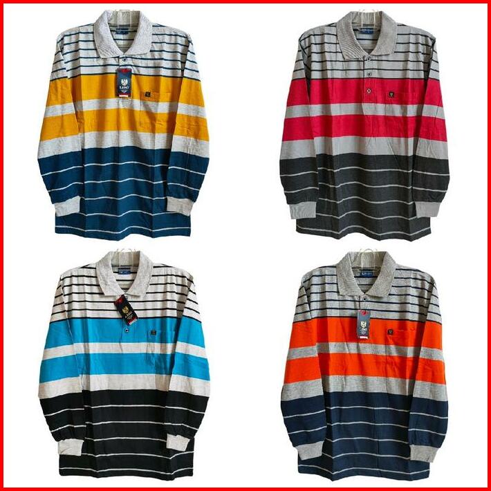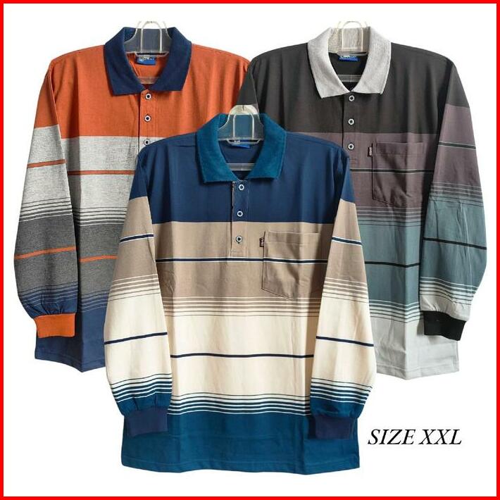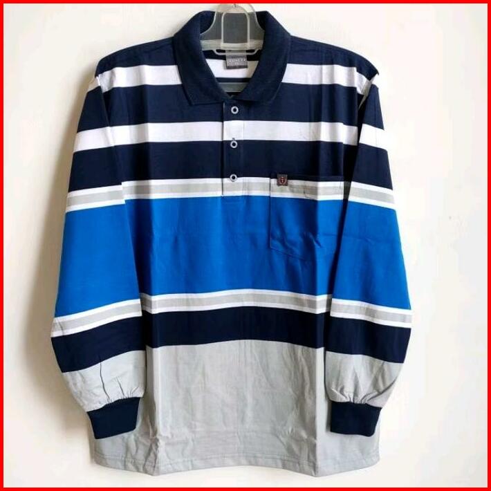 Kaos Kerah Saku Pria Motif Salur Lengan Panjang Uk Xxl Polo Baju Garis Dewasa Cowok Stripe Atasan Kancing Casual Santai