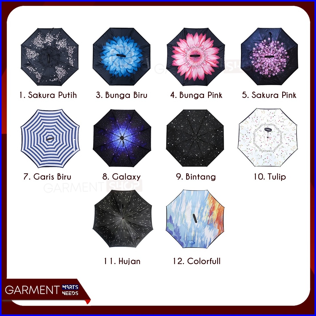 RANDOM, HITAM, PINK, MERAH, BIRU, UNGU, FUCHSIA, NAVY, MAROON, 1. SAKURA PUTIH, 3. BUNGA BIRU, 4. BUNGA PINK, 5. SAKURA PINK, 7. GARIS BIRU, 8. GALAXY, 9. BINTANG, 10. TULIP, 11. HUJAN, 12. COLORFULL, SCOTLITE RANDOM, 2. SCOTLITE HITAM, 3. SCOTLITE PINK, 5. SCOTLITE HIJAU, 8. SCOTLITE BIRU, 13. SCOTLITE ABU