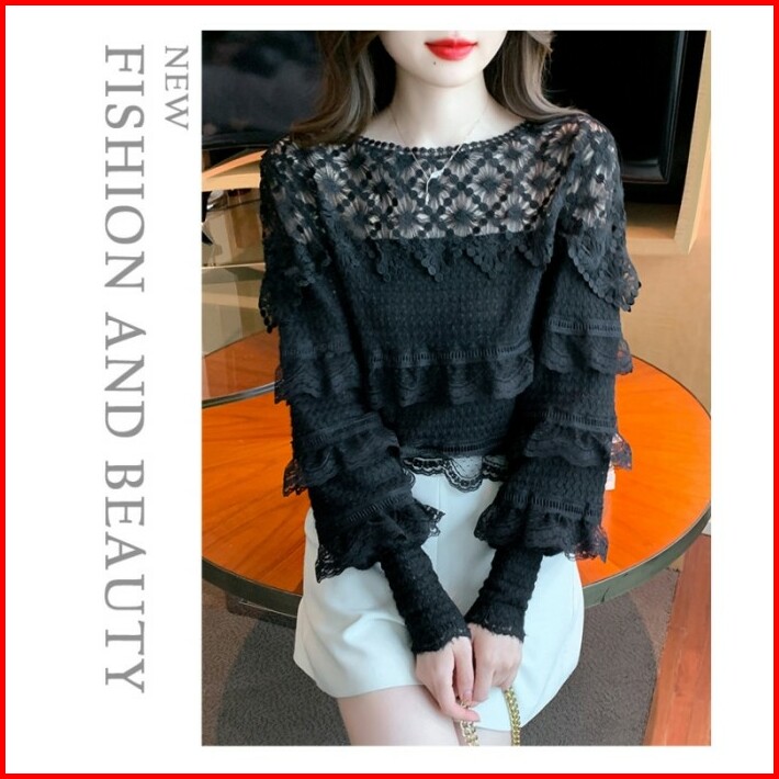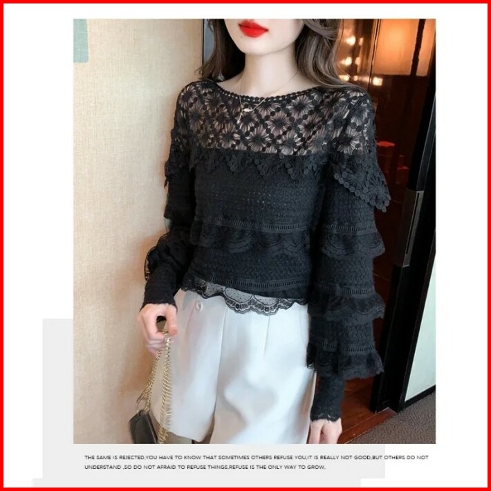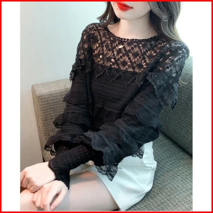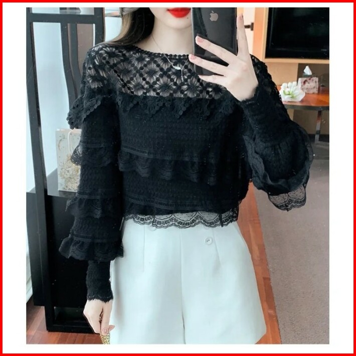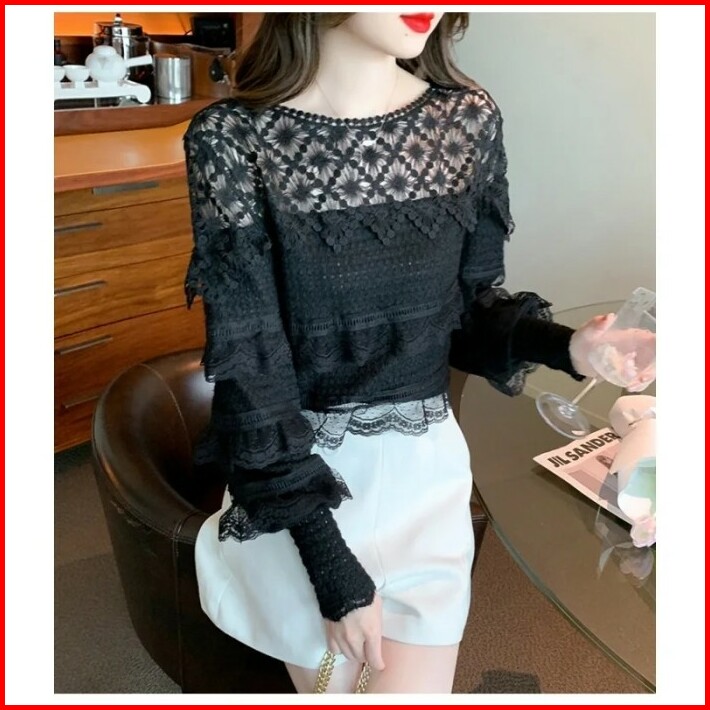 Blouse Wanita Brukat Hitam Cantik Di Lengan Panjang Renda Korea Elegan