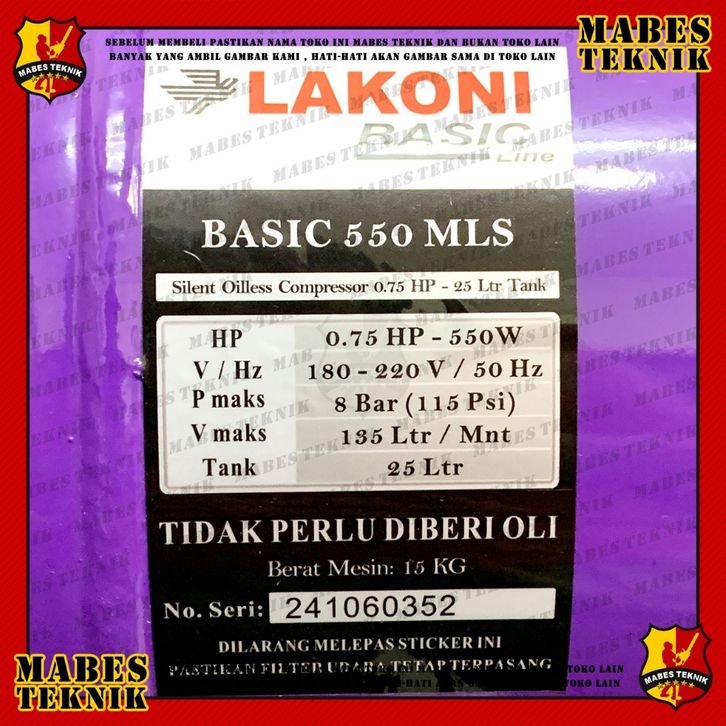 Kompresor Lakoni Basic 550 ML Series Terbaru Silent Tanpa Oli 25 Liter - 0,75HP 550Watt Kecil