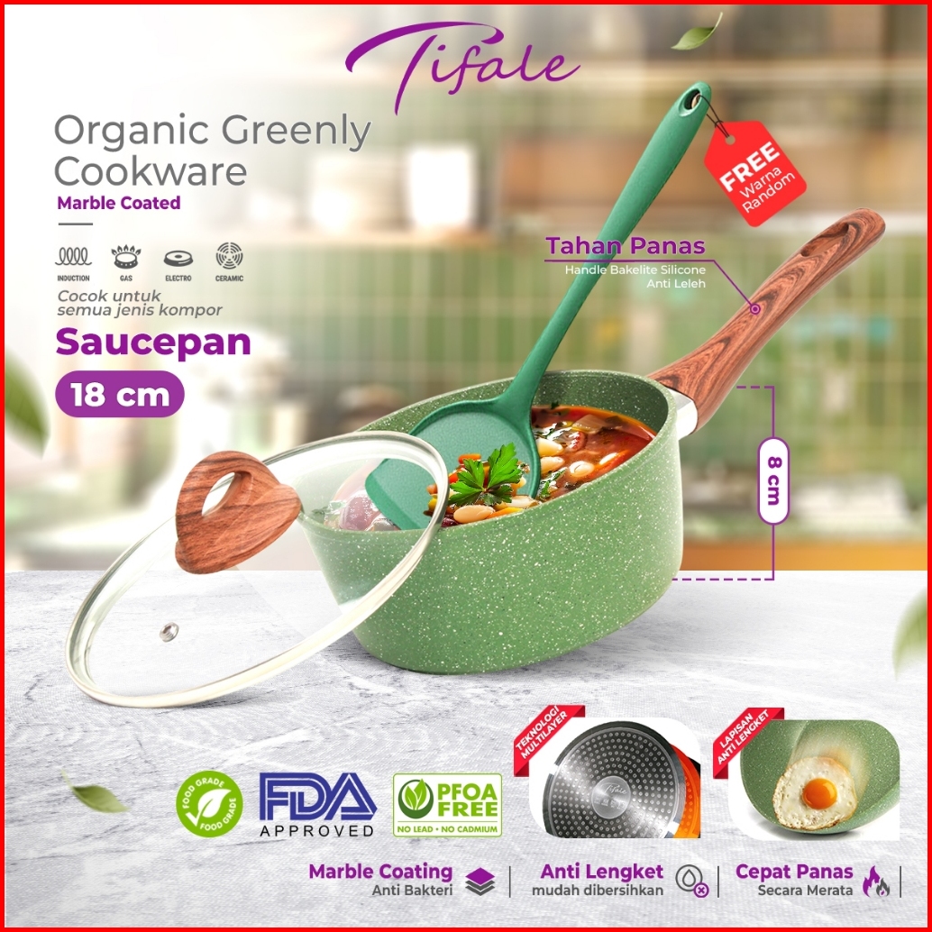 Tifale Organic Greenly Cookware Saucepan Marble Coated Anti Lengket Handle Bakelite Silicone Anti Leleh Avocado Pan