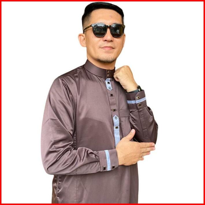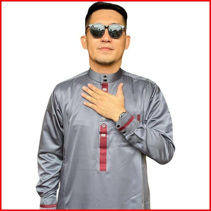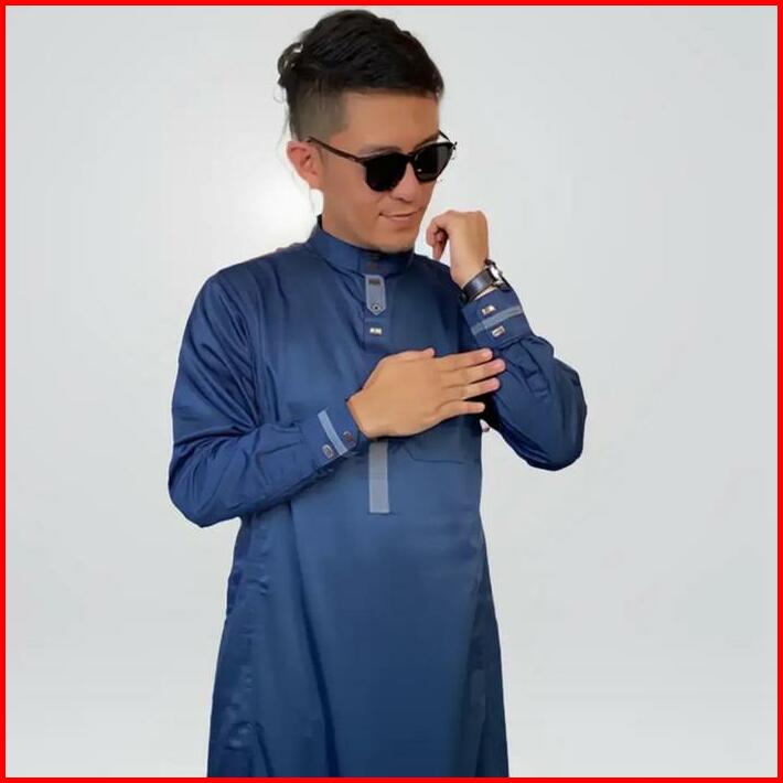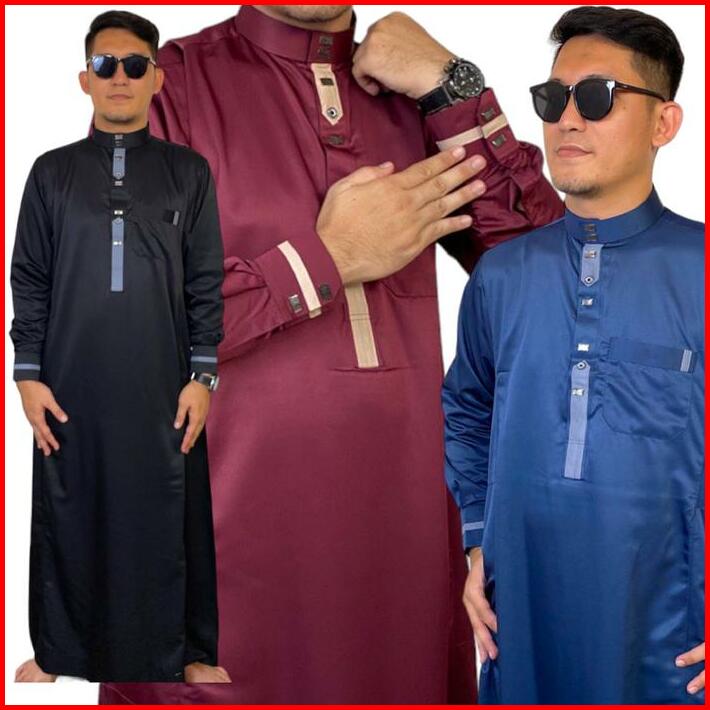 Jubah Gamis Slimfit Pria Muslim Dewasa Emirates 3 Lengan Panjang Manset Berkancing Bahan Satin Twill Hitam Tebal Glosy T
