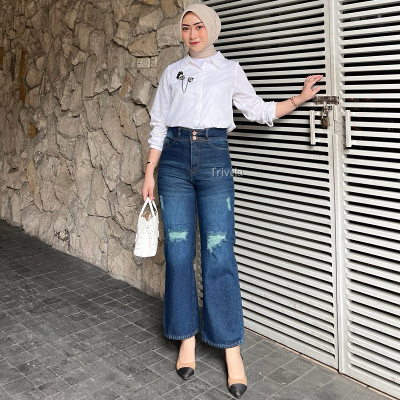 (Gratis Ongkir) TRIVELA - Erica Cullotes Sobek Lapis | Kulot Jeans Ripped Hijab Friendly 27-38 | Jeans Wisker