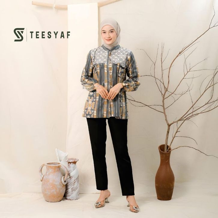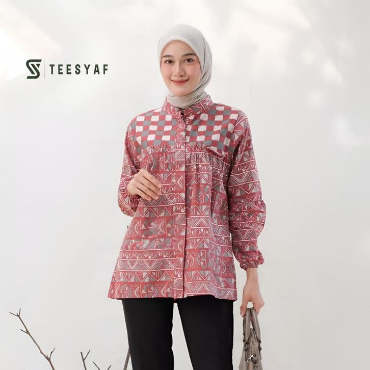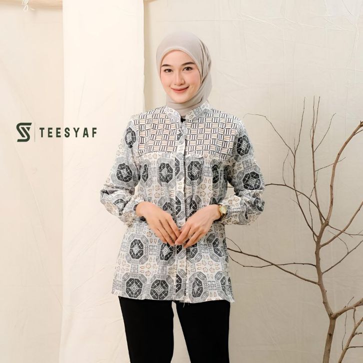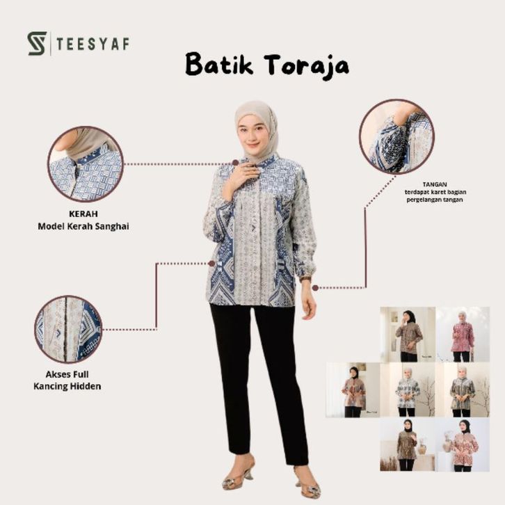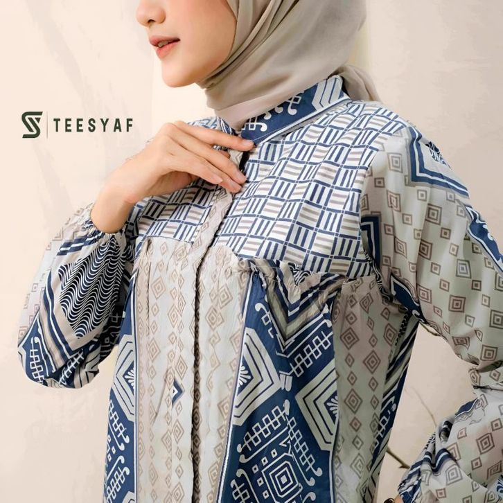 TEESYAF - Blouse Batik Atasan Wanita Kerja Modern Motif Toraja Biru
