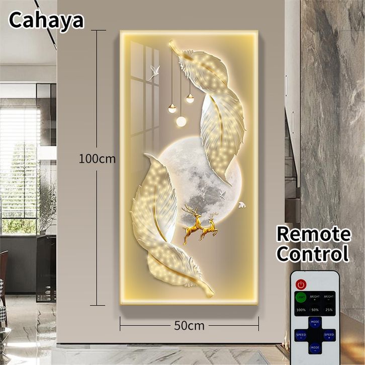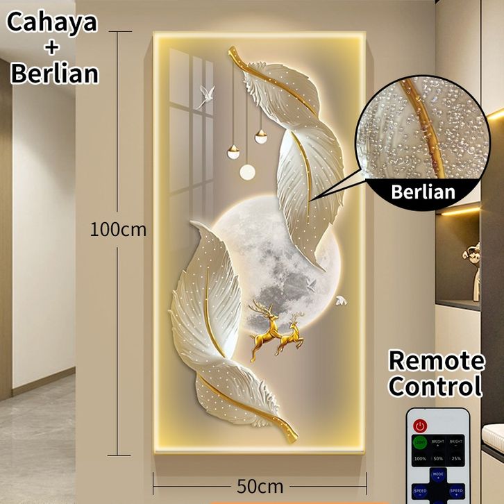 Lampu Dinding Lukisan Crystal Porcelain 5D Remote Control Luxury Walldecor Motif Bulu dan Bentuk Tanduk Gold Dekorasi