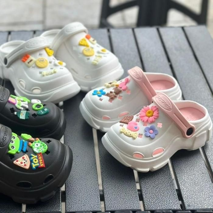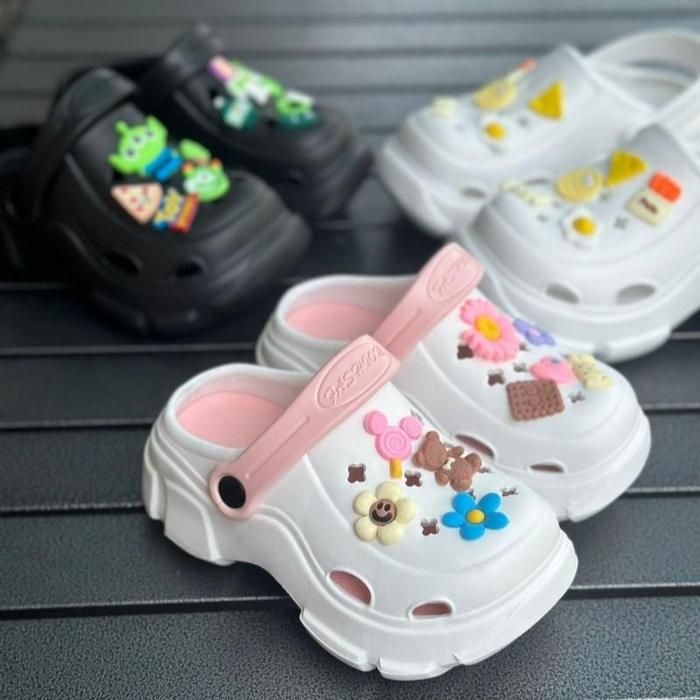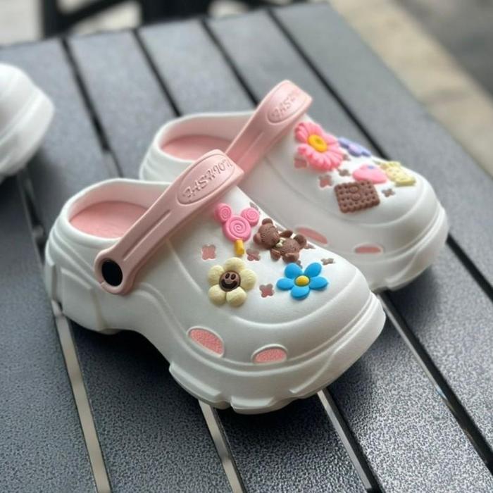 Sandal anak perempuan 2-12 tahun koleksi baru sepatu lubang-lubang gaya Korea dengan aksesori - 2305PUTIH+PINK+AKS07