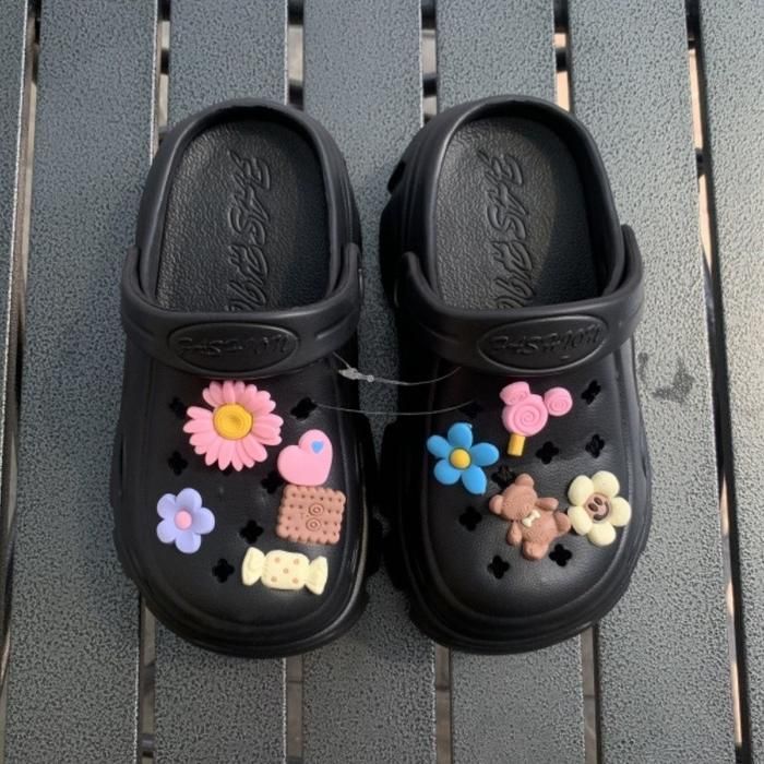 Sandal anak perempuan 2-12 tahun koleksi baru sepatu lubang-lubang gaya Korea dengan aksesori - 2305-HITAM+AKS01
