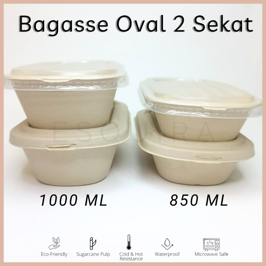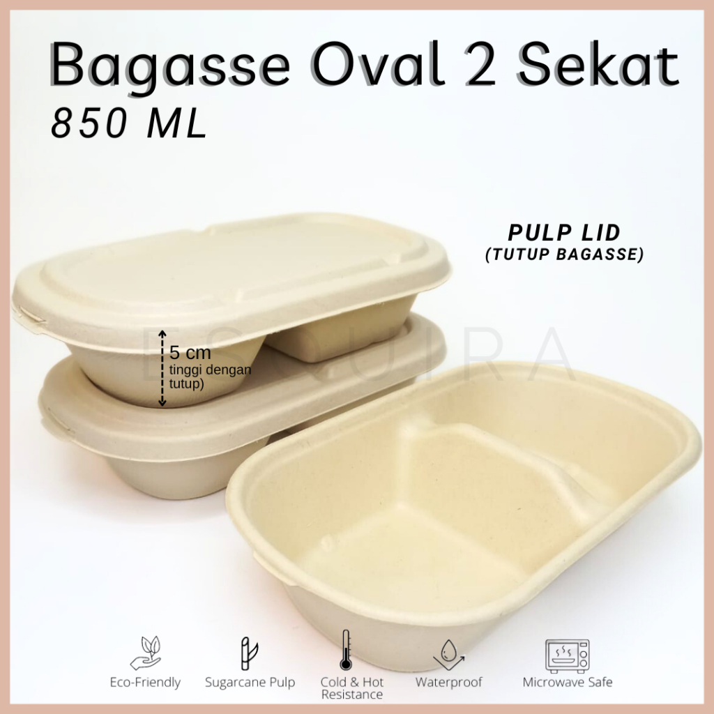 2 Compartement Oval Sugarcane Bagasse 850 ML / Lunch Box 10 Pcs + Lid / TAB8502C
