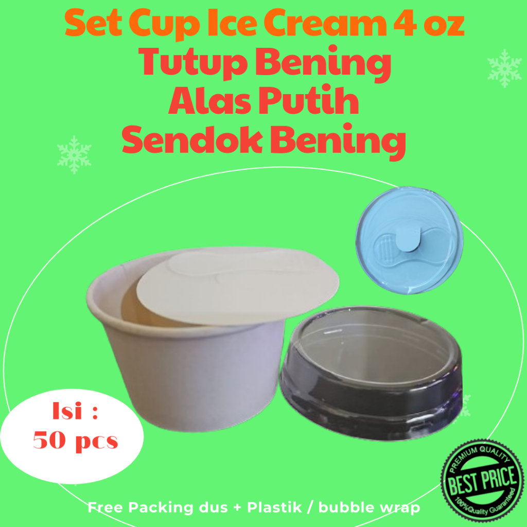 SET Paper Ice Cream Cup 4 oz + Tutup + Sendok + Penutup/ Alas Cup isi 50 pcs