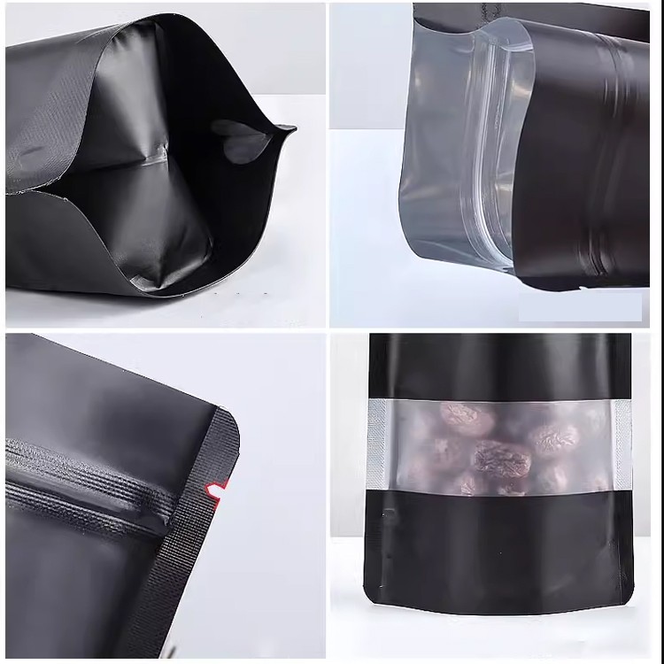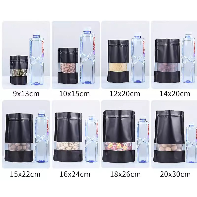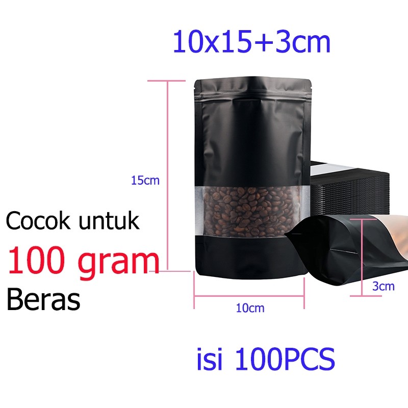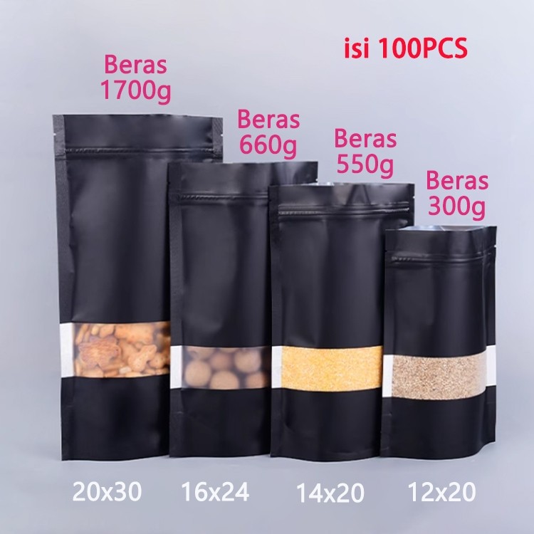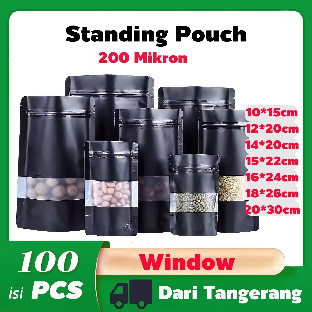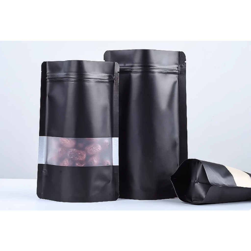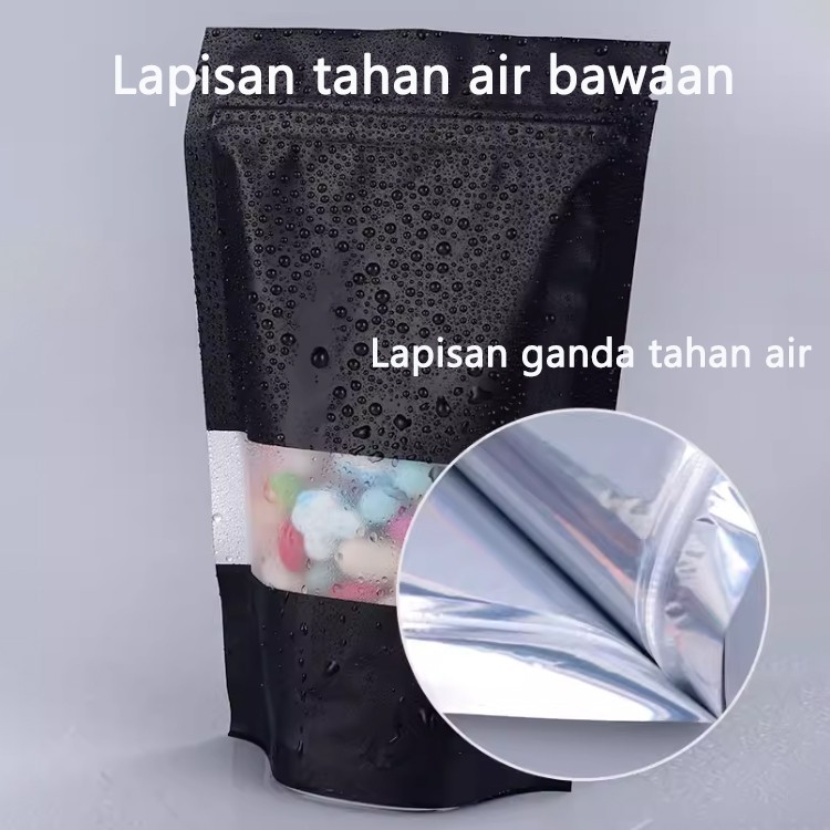 Standing Pouch Aluminium Foil + Window Ziplock - Kemasan Makanan/Snack Anti Bocor (Isi 100 Lembar Hitam), Cocok untuk Us