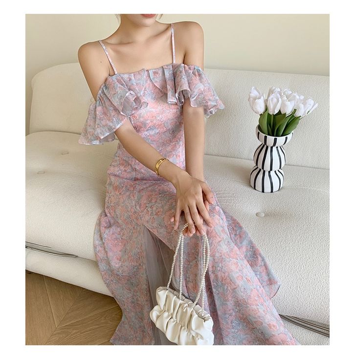 Dress Wanita Sifon Bunga Newlan Qz047 Loral Perancis Gaun Cewek Vneck Mid Length Manis Gaya Korea