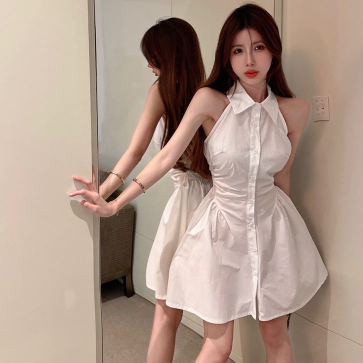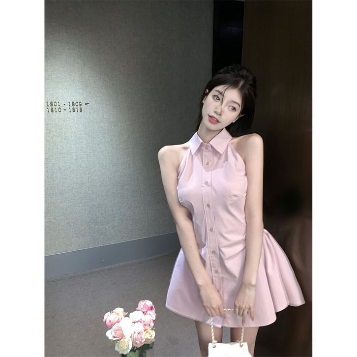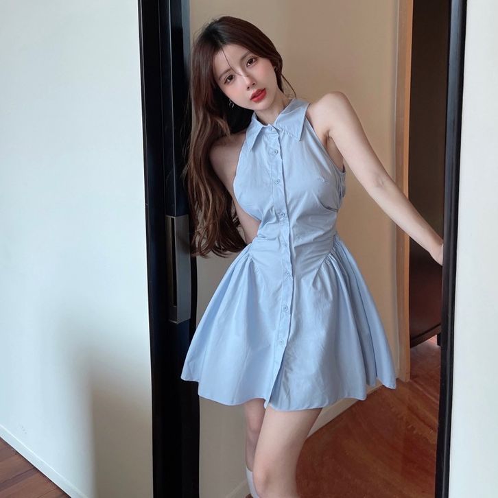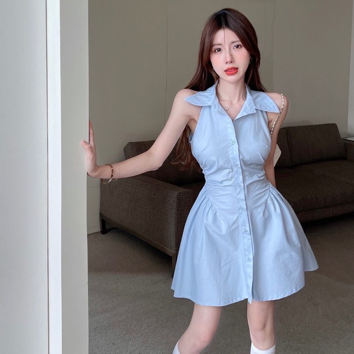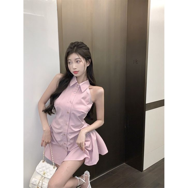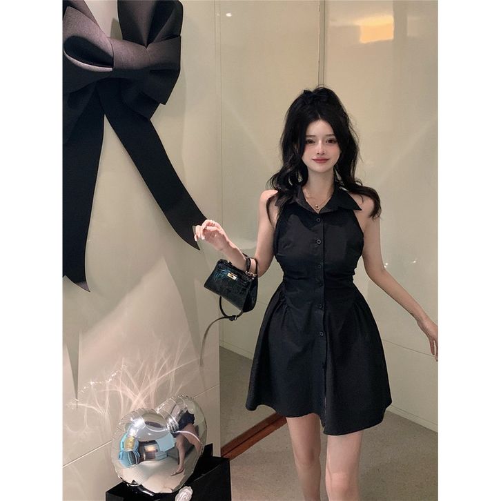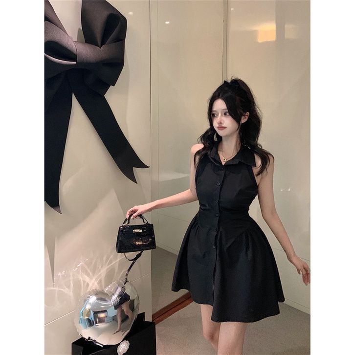 gaun tanpa lengan kemeja kerah polo hitam wanita rok pendek pinggang a line musim panas wanita