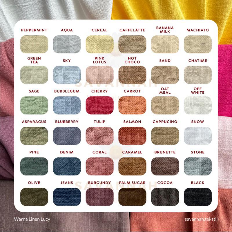 Black, Off White, Snow, Chatime, Sand, Cereal, Greentea, Aqua, Pink Lotus, Banana Milk, Oat Meal, Caramel, Sage, Sky, Cherry, Butter, Hot Choco, Caffe Latte, Asparagus, Stone, Tulip, Carrot, Brunette, Cappucino, Pine, Denim, Coral, Salmon, Cocoa, Peppermint, Olive, Bubblegum, Burgundy, Palm Sugar, Blueberry, Machiato, Jeans