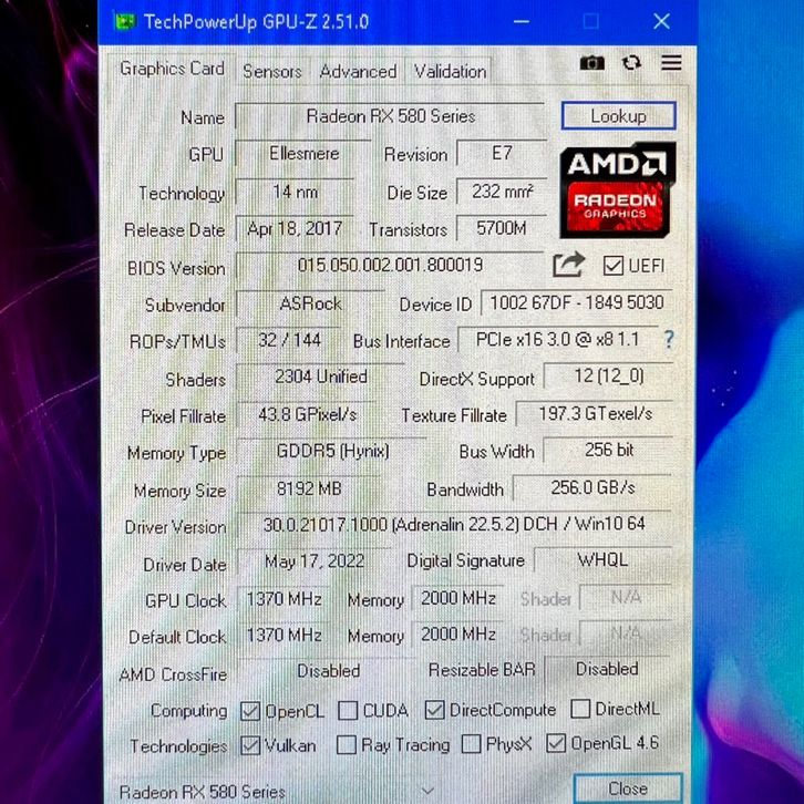 VGA RX 580 8GB ASROCK PHANTOM GAMING GDDR5