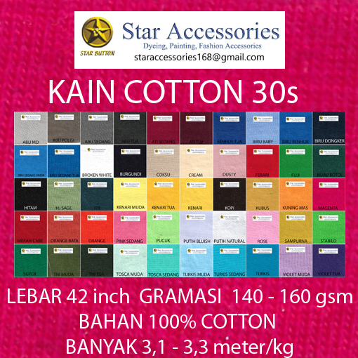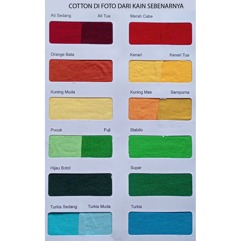 ABU MUDA, ABU POLISI, ABU SEDANG, ABU TUA, MERAH HATI SEDANG, MERAH HATI TUA, BENHUR TUA, BIRU BABY, BIRU BENHUR MUDA, BIRU DONGKER, BIRU SEDANG MUDA, BIRU SEDANG TUA, BROKEN WHITE, BURGUNDI, COKLAT SUSU, CREAM, DUSTY, FERARI, FUJI, HIJAU BOTOL, HITAM, HIJAU SAGE, ITB, KENARI MUDA, KENARI TUA, KENARI, KOPI, KUBUS, KUNING MAS, MAGENTA, MERAH CABE, ORANGE BATA, ORANGE, PINK SEDANG, PUCUK, PUTIH BLUISH, PUTIH NATURAL, ROSE, SAMPURNA, STABILO, SUPER, TNI MUDA, TNI TUA, TOSCA MUDA, TOSCA SEDANG, TURKIS MUDA, TURKIS SEDANG, TURKIS, VIOLET MUDA, VIOLET TUA