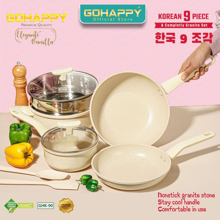 PANCI SET KOREA GOHAPPY 9PCS ANTI LENGKET GRANITE TOSCA PINK VANILLA 9 PIECE KOREAN COOKWARE PREMIUM