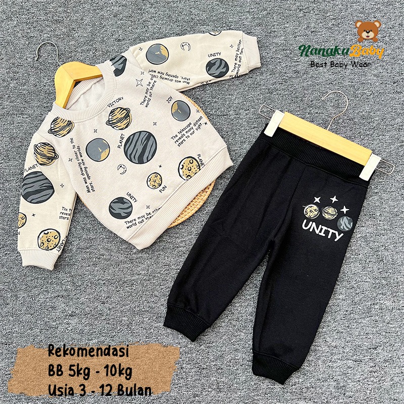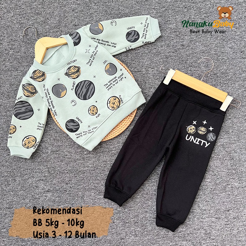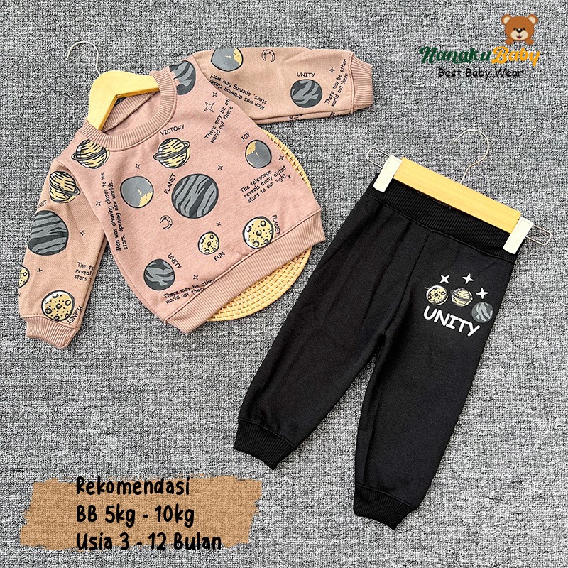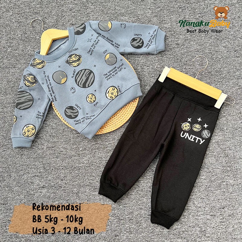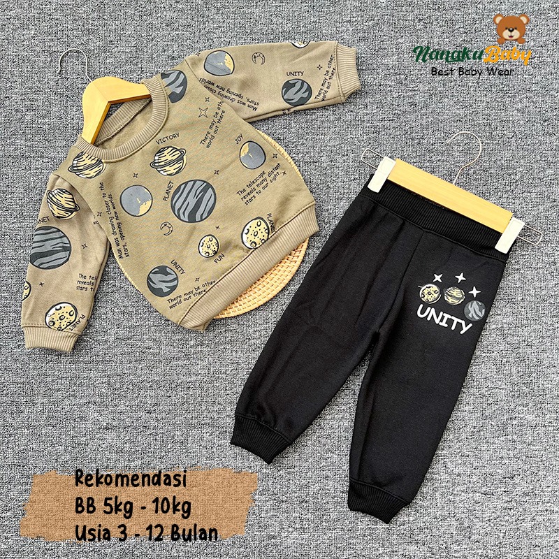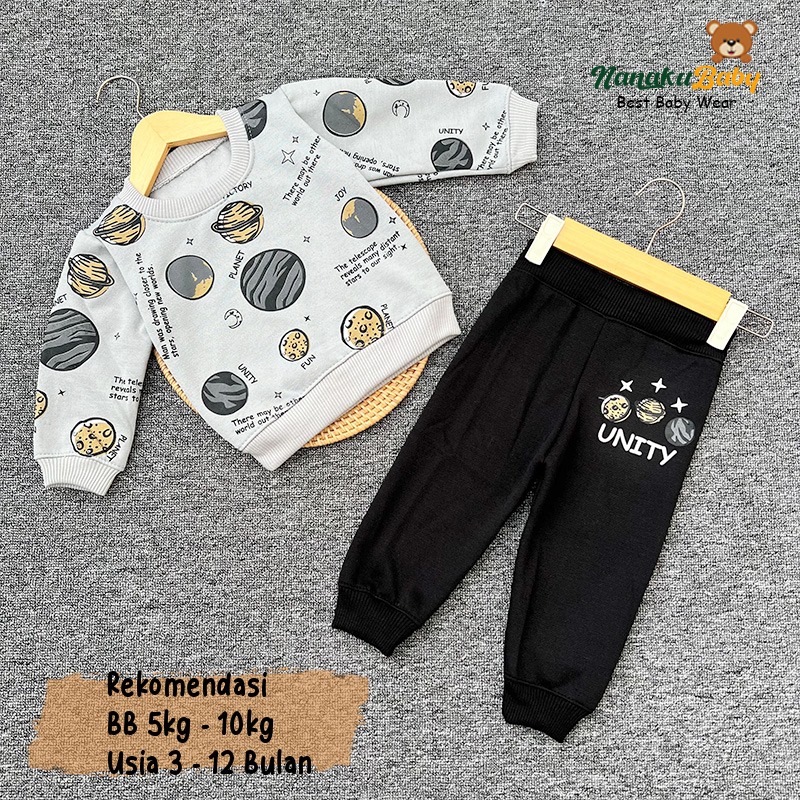 Nanaku Baby - Setelan Baju Sweater Celana Joger Bayi Bahan Katun Fleece Usia 3-12 Bulan Motif Planet Unity