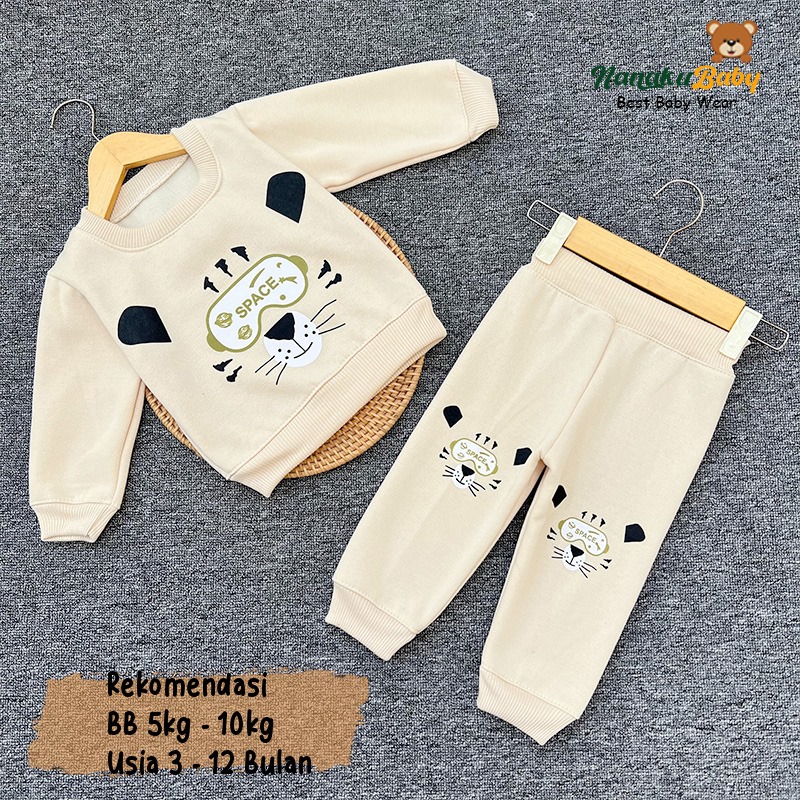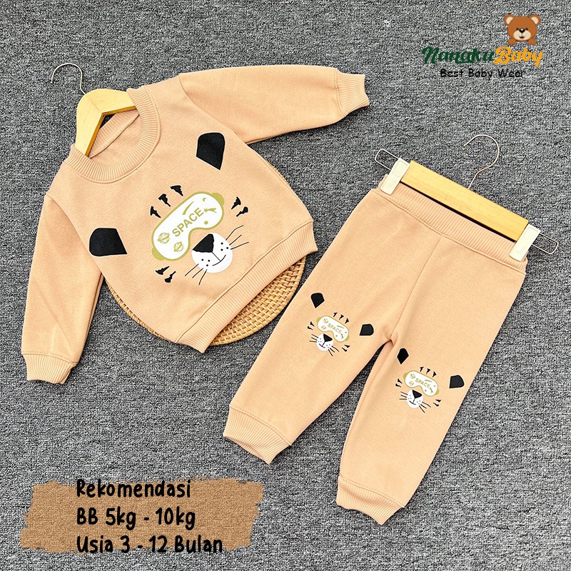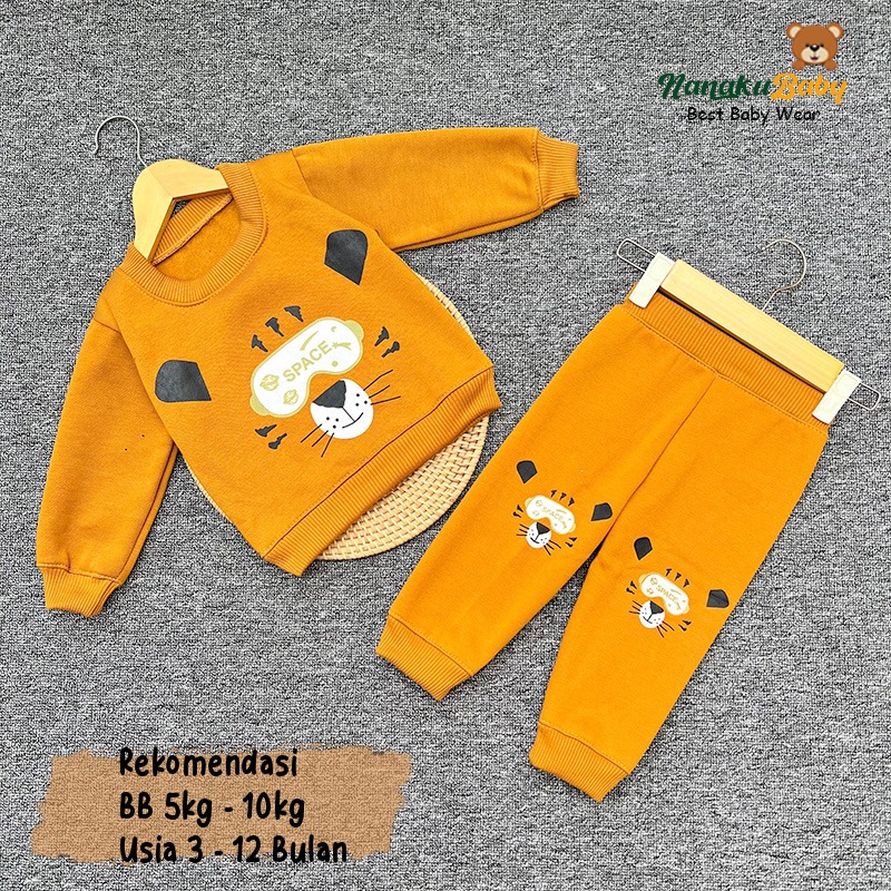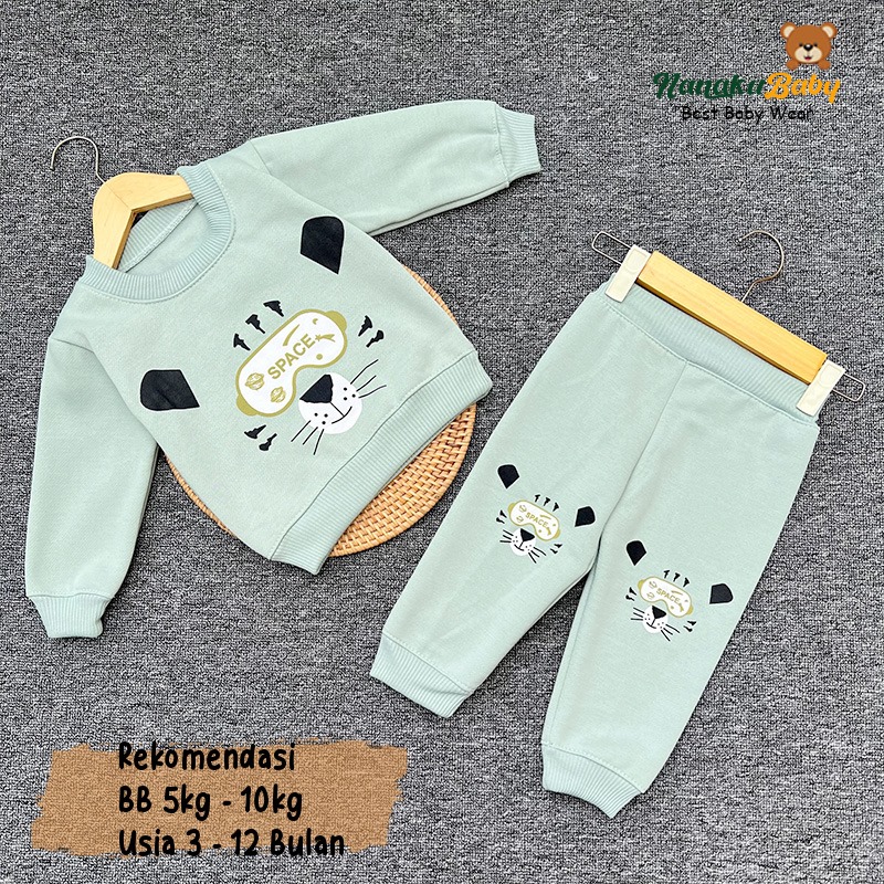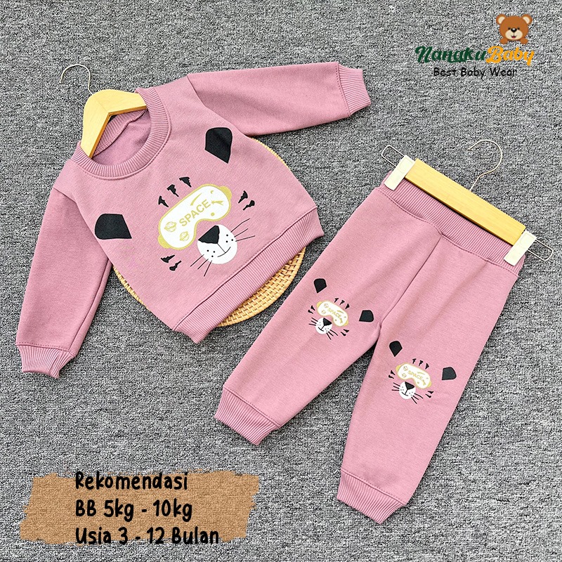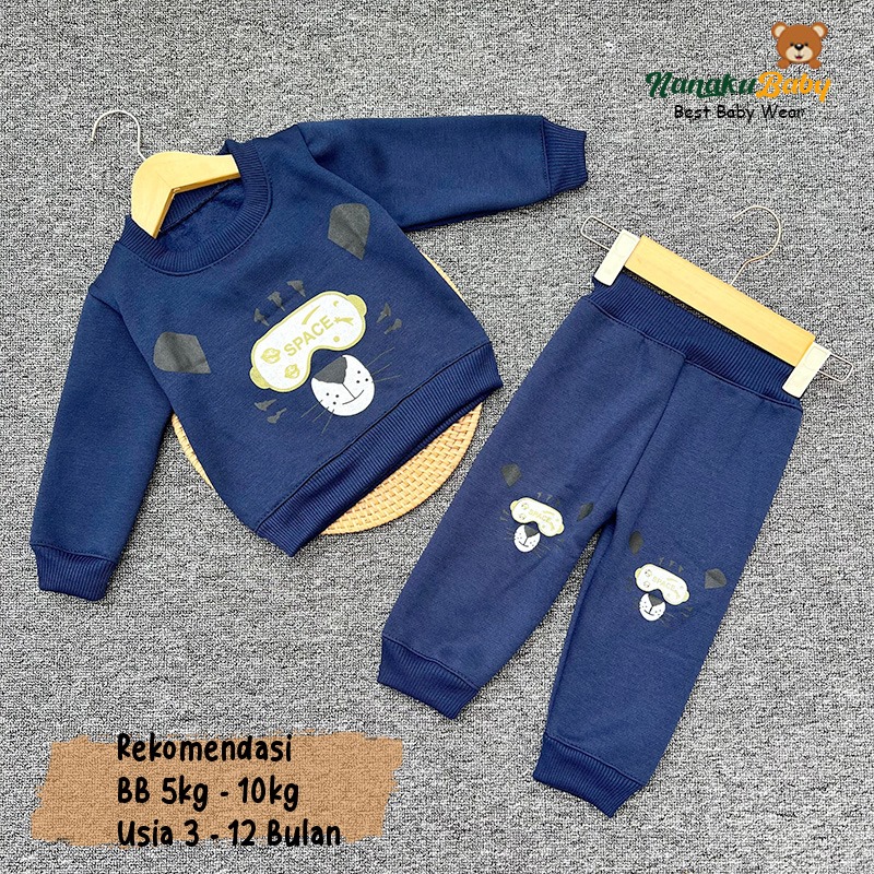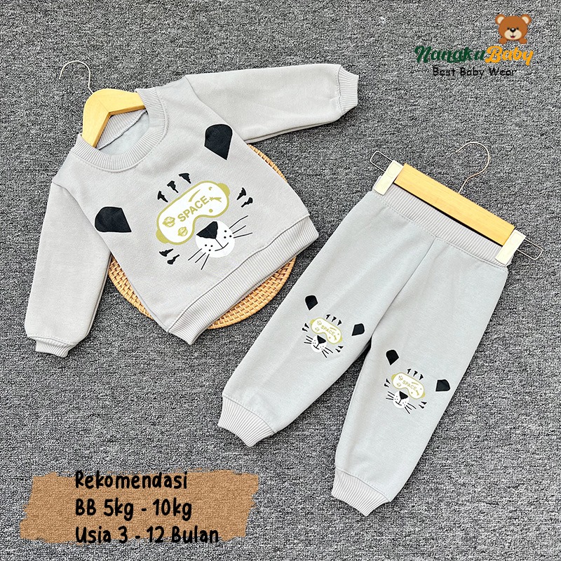 Nanaku Baby - Setelan Baju Sweater Celana Joger Bayi Bahan Katun Fleece Usia 3-12 Bulan Motif Space Cat