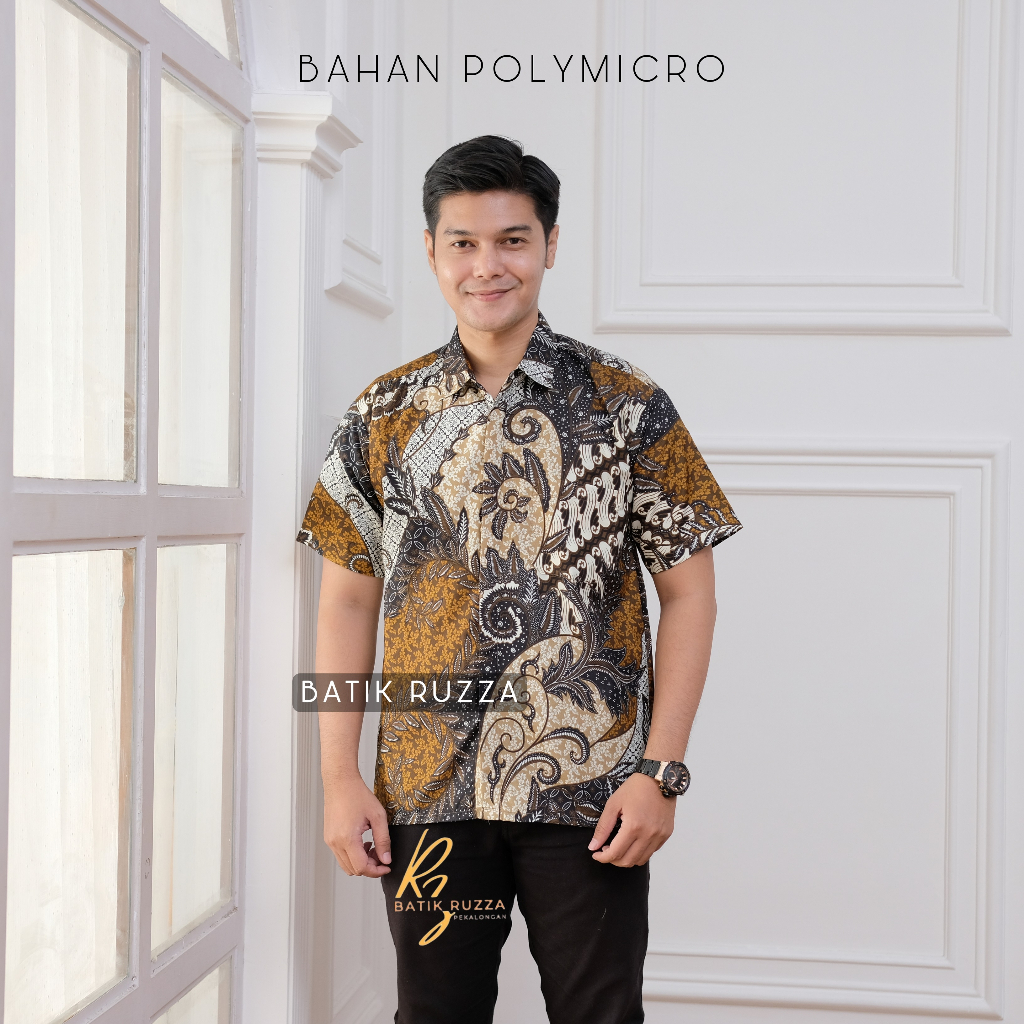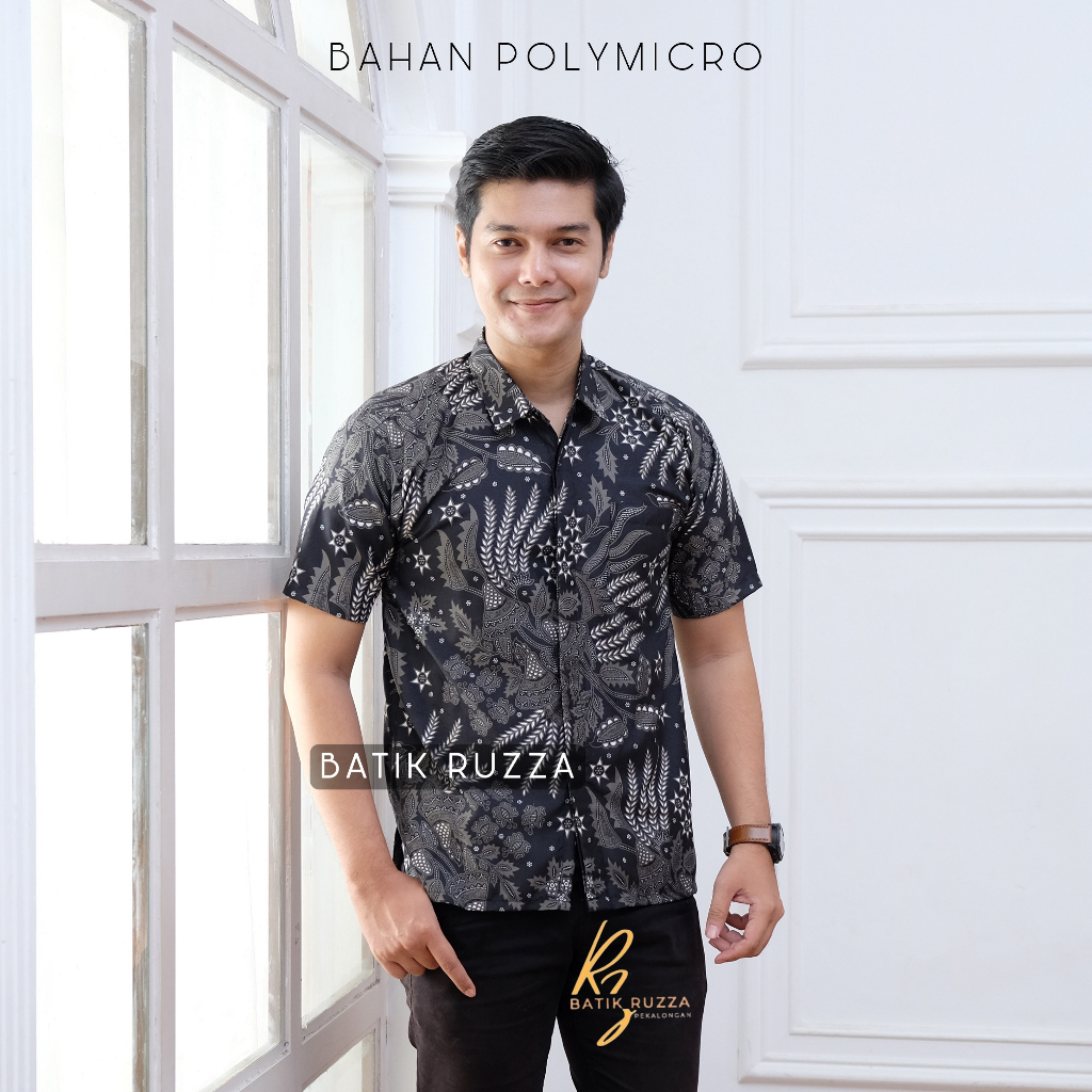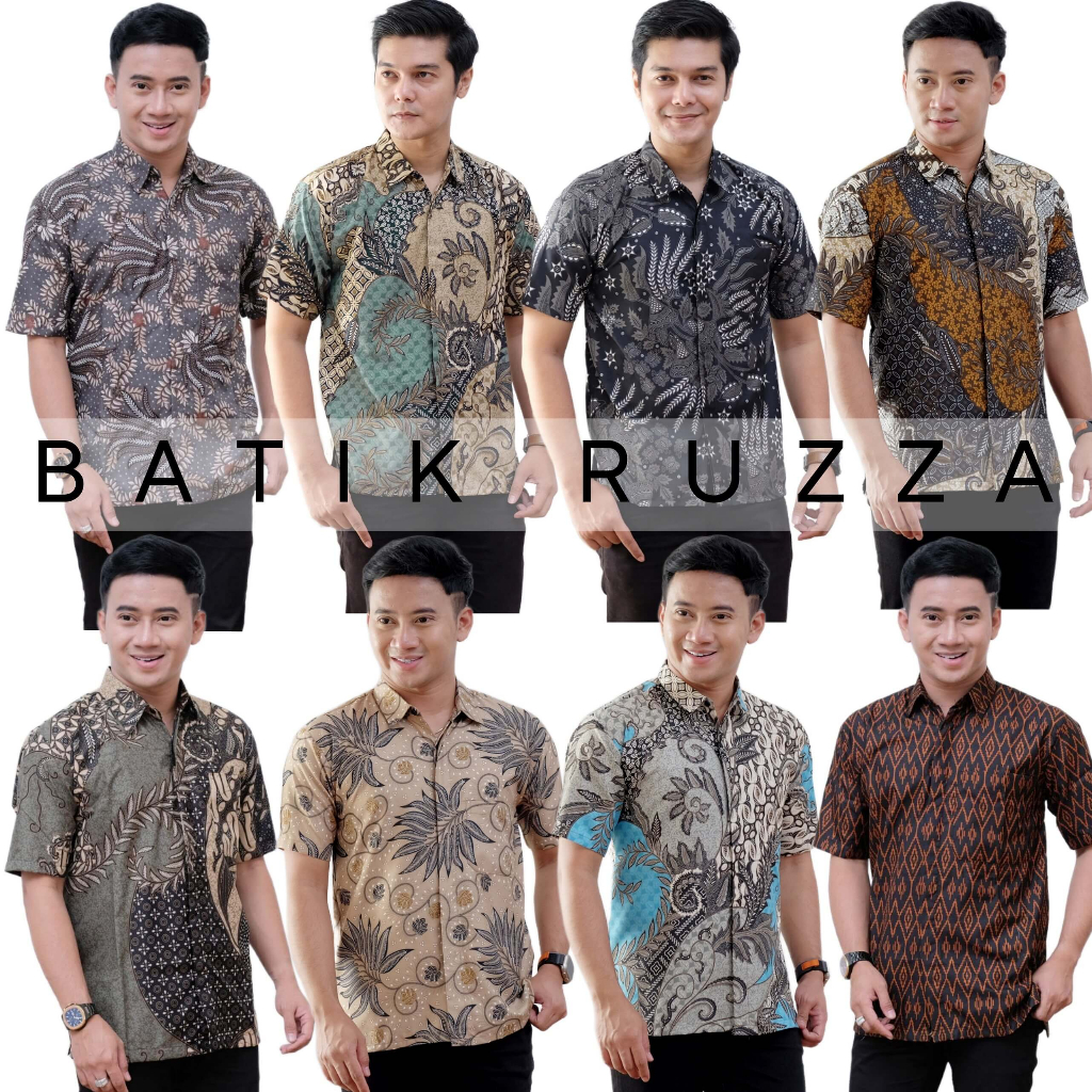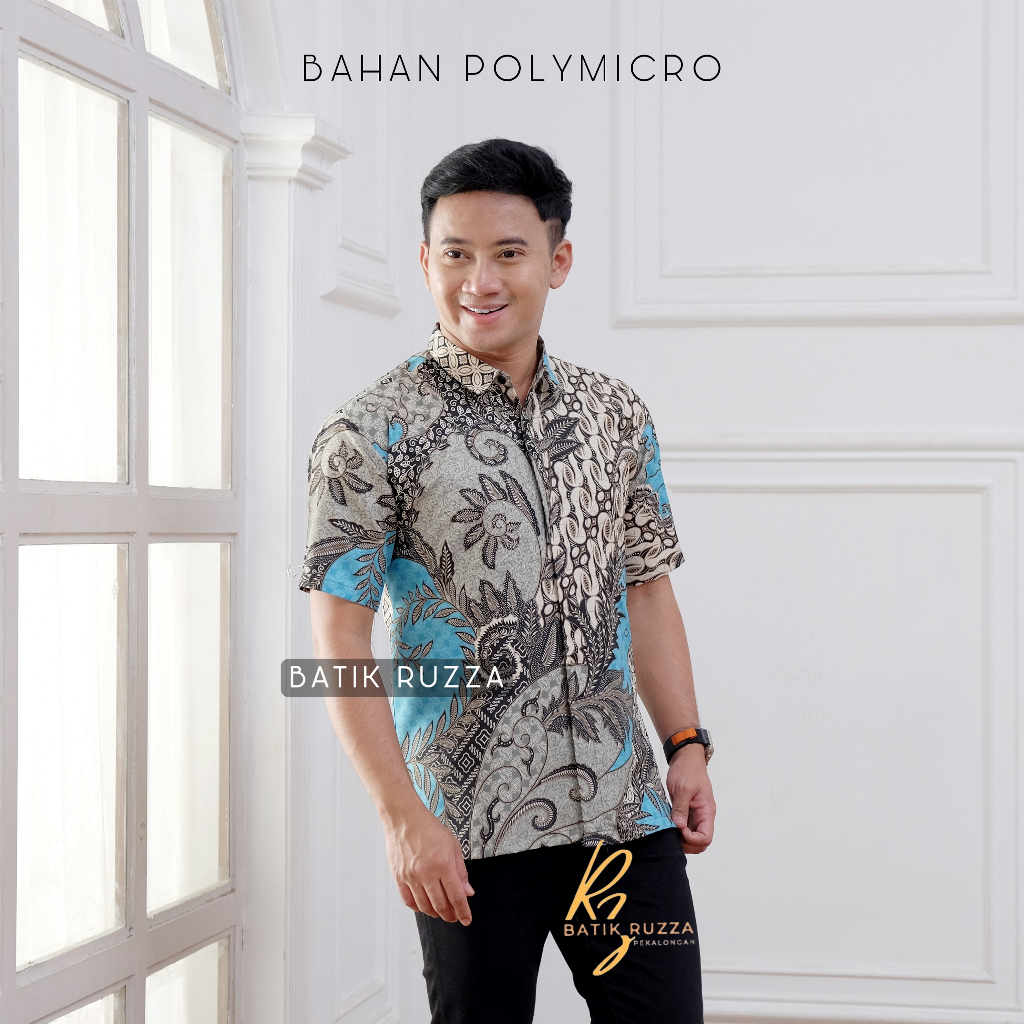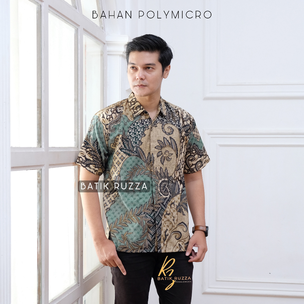 Kemeja Batik Pria Lengan Pendek Motif Manggar Abu Sage Cowok Laki Dewasa Size M L XL XXL RUZZA