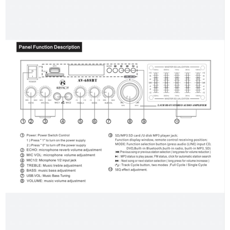Amplifier Kerndy Bluetooth 5.2 Audio EQ AV-688BT Channel 2.1 Full Bass SUBWOFER Amplifier Karaoke Home Theater AV-688BT