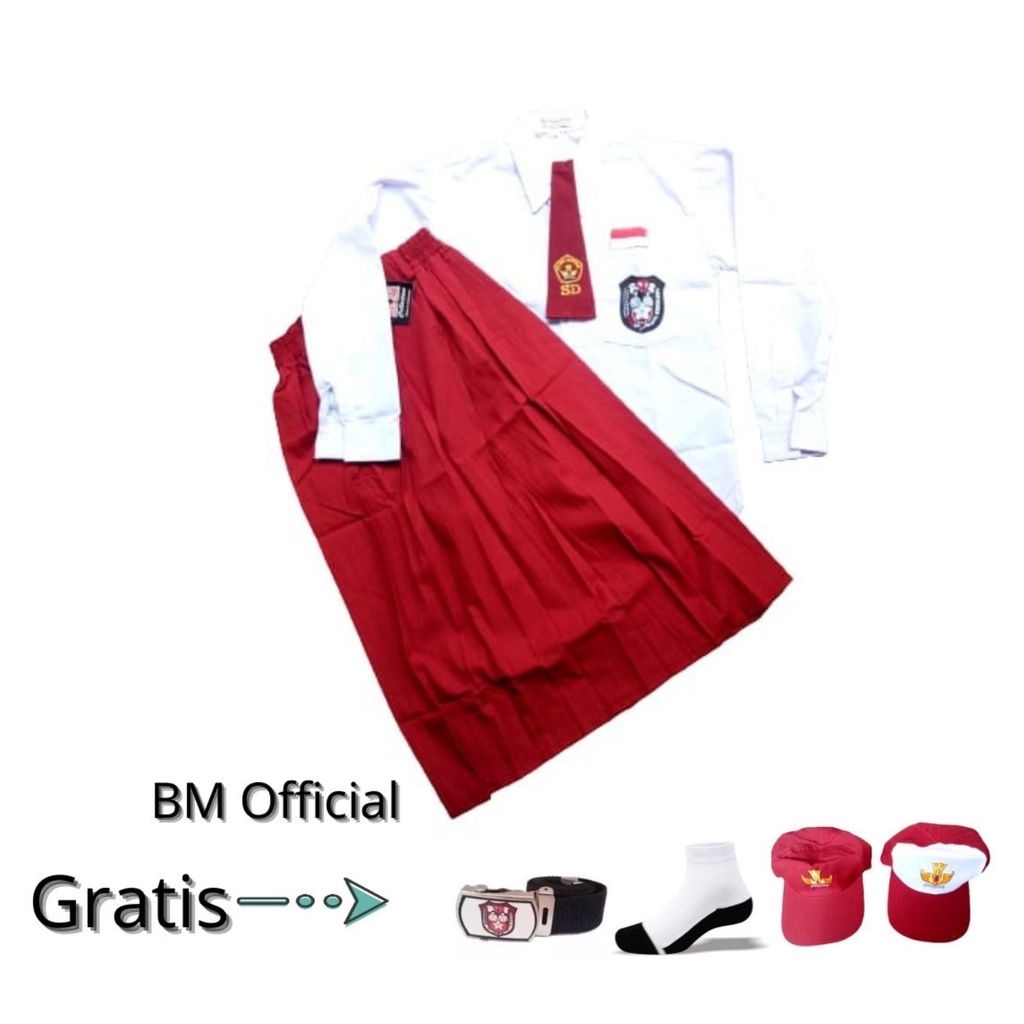 Seragam Sekolah Kemeja Baju Atasan Putih Rok Merah Panjang Anak SD Perempuan Setelan Lengkap Komplit Bonus Topi Ikat Pin